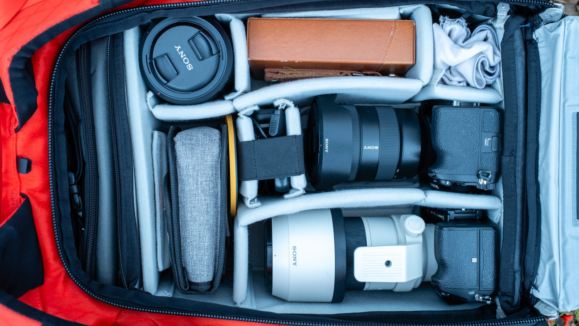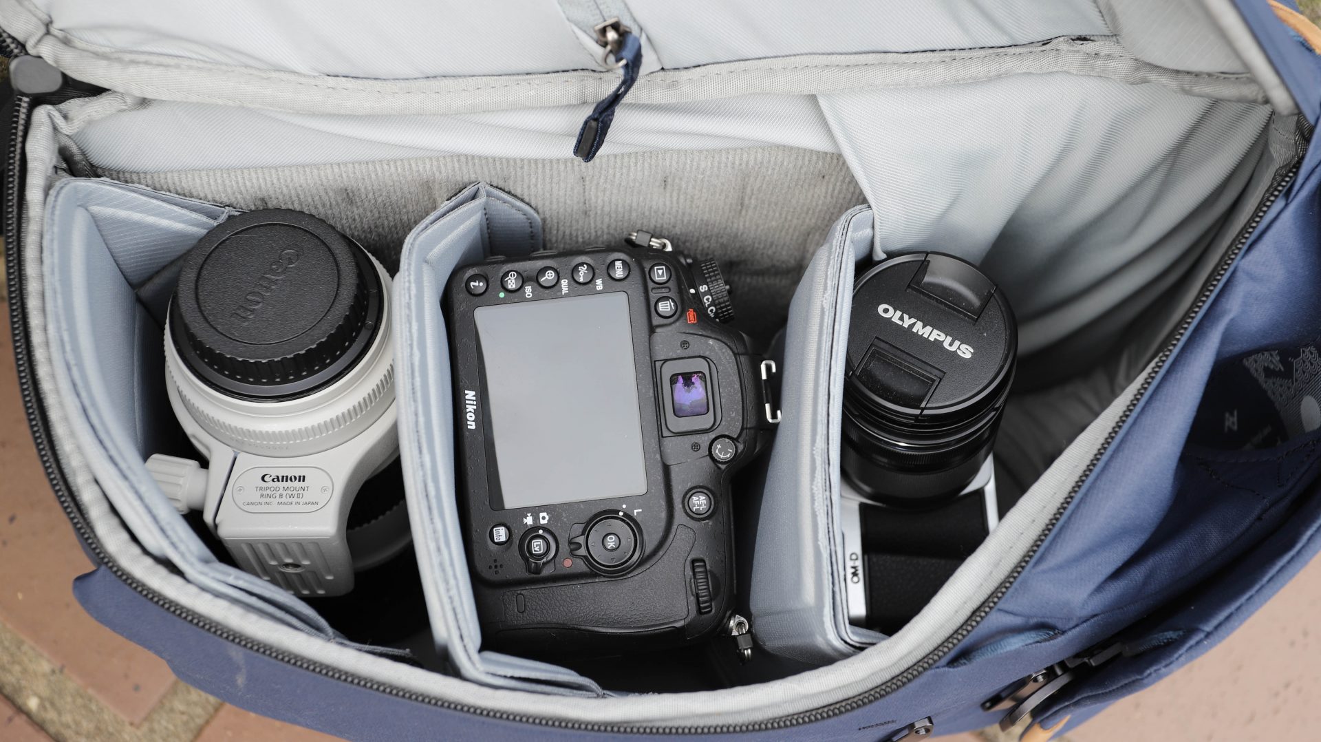 Все начинается с загрузки. Мы загружаем каждую сумку для фотоаппаратов различными комбинациями съемочного оборудования, чтобы увидеть, как заявленная вместимость соотносится с реальным пространством для хранения. Мы проверяем, насколько легко можно упаковать корпуса камер разных размеров, включая модели APS-C и полнокадровые беззеркальные, а также зеркальные фотокамеры. При необходимости мы переставляем разделители, чтобы увидеть, сколько объективов можно разместить, как прикрепленных к камере, так и отдельно.