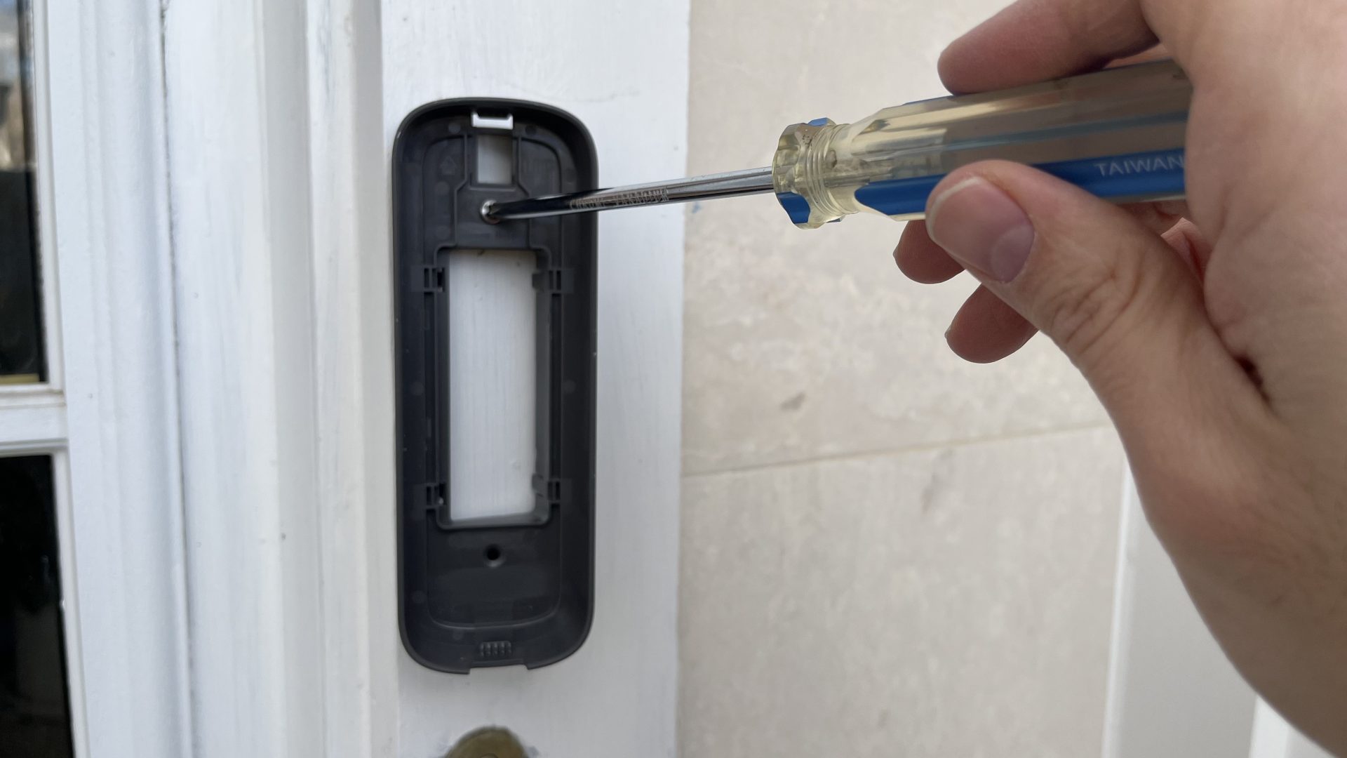 - Вы хотите установить его под углом. Маленький металлический кронштейн и неудобный винт для защиты от взлома трудно установить на косяк входной двери.