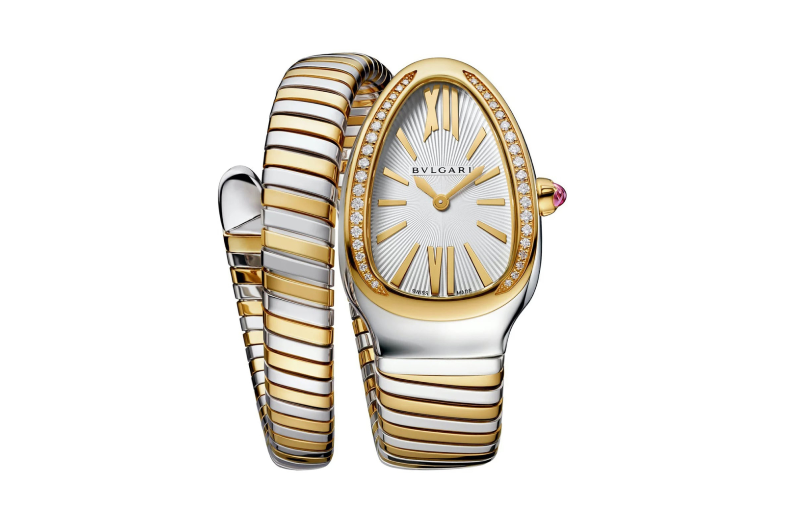 | Лучшие женские ювелирные часы | Bulgari Serpenti Tubogas — больше ювелирное украшение, чем часы, Serpenti обвивают запястье, как свернувшийся браслет, сочетая итальянскую драму с серьезным мастерством — они смелые, экзотичные и созданы, чтобы привлекать взгляды. |