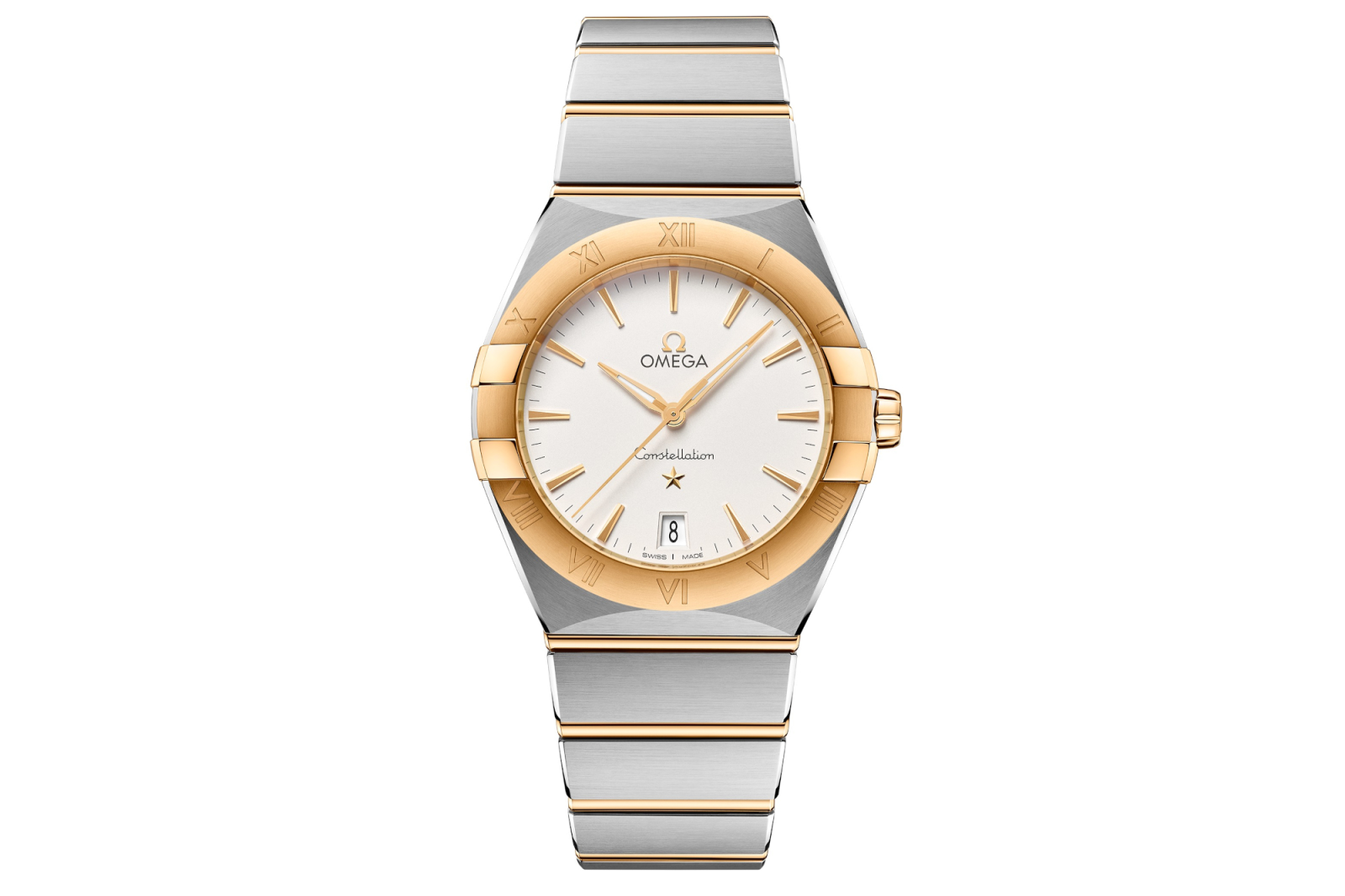 Omega Constellation с ее фирменными «когтями» и римскими цифрами, выгравированными на матовом стальном безеле. Доступные в различных размерах, эти универсальные часы сочетают стиль 80-х с современной точностью.