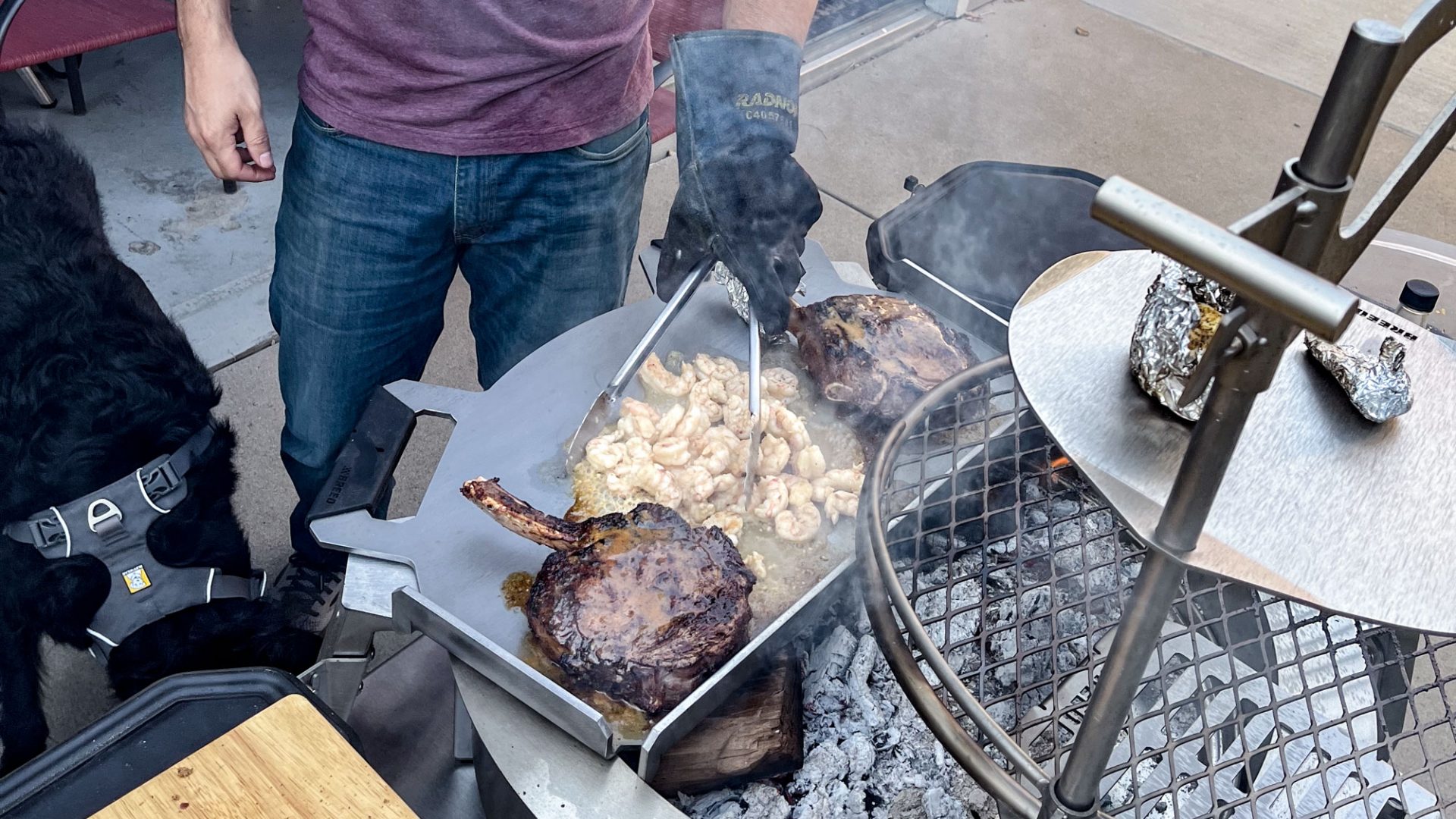 Дэн приготовил целый пир, когда тестировал этот гриль. Он идеально поджарил на огне два ковбойских стейка, а также маринованные креветки, овощи, сладкий картофель и даже приготовил свеклу в котелке (который, как он предупреждает, вам придется приправить, чтобы предотвратить прилипание, так как он из чугуна).