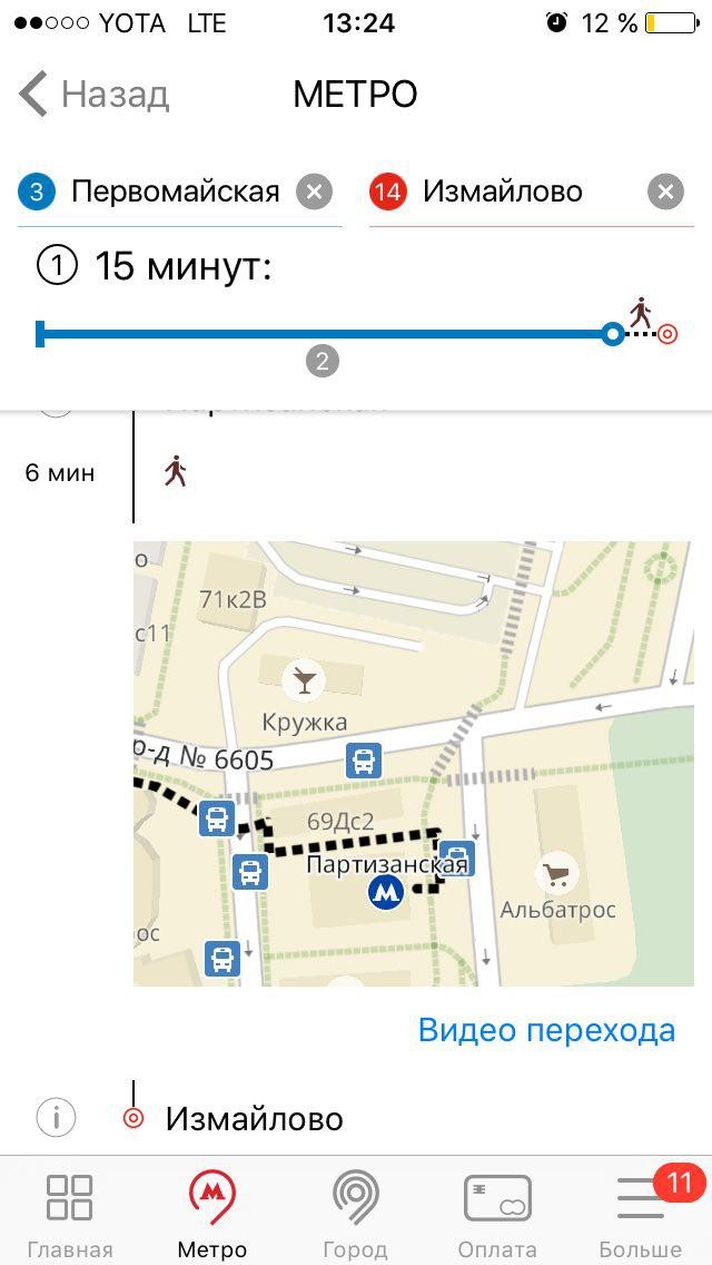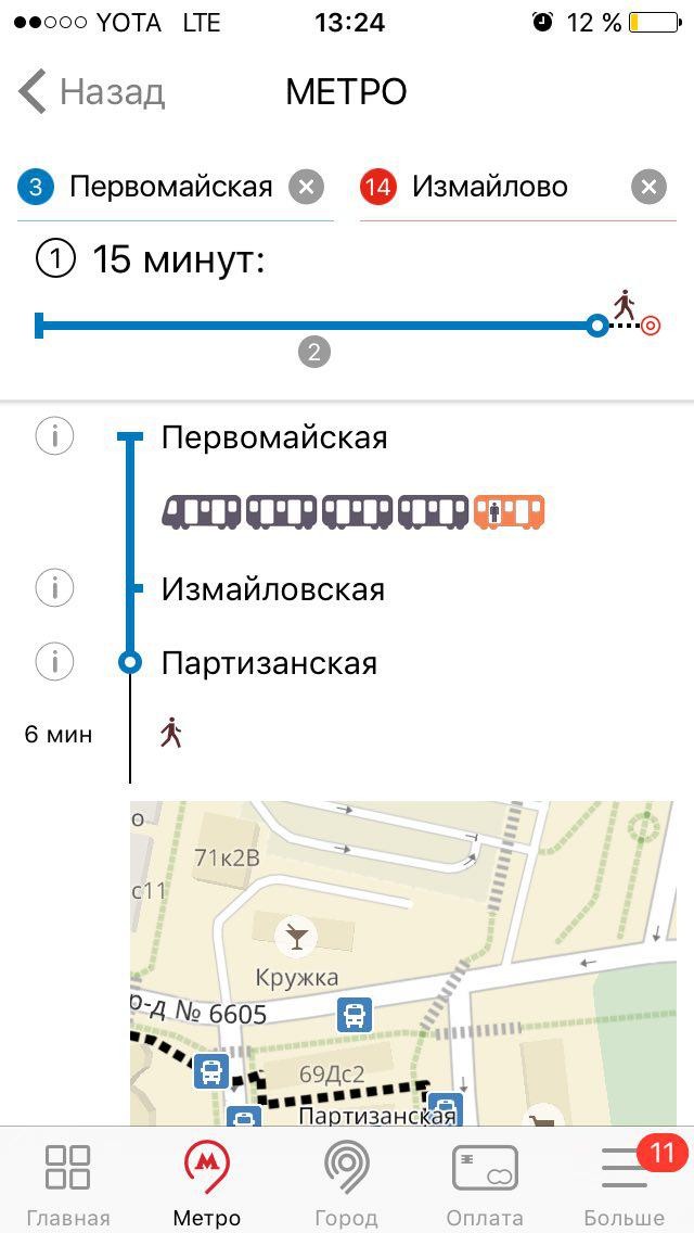 Приведу другой пример, который демонстрирует некомпетентность обоих приложений. Маршрут мне очень знакомый и сразу уточню: на переход от перрона метро «Партизанская» до перрона станции МЦК «Измайлово» придется потратить не меньше 10 минут (и придется чуть ли не бежать). Что показывают нам приложения и как рассчитывают время?