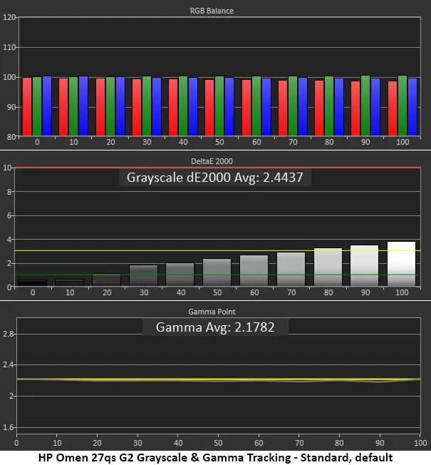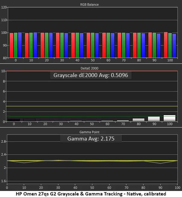 В стандартном режиме Omen 27qs G2 использует sRGB для SDR-контента. Чтобы получить полный цветовой охват, переключитесь в режим «Native». Я откалибровал оттенки серого с помощью ползунков RGB и получил эталонные значения. Предустановок гаммы нет, но монитор очень близок к стандарту 2.2. Мои рекомендуемые настройки приведены ниже. Для HDR регулировка недоступна, но точность отличная, а динамическая контрастность увеличивает соотношение примерно до 8200:1.