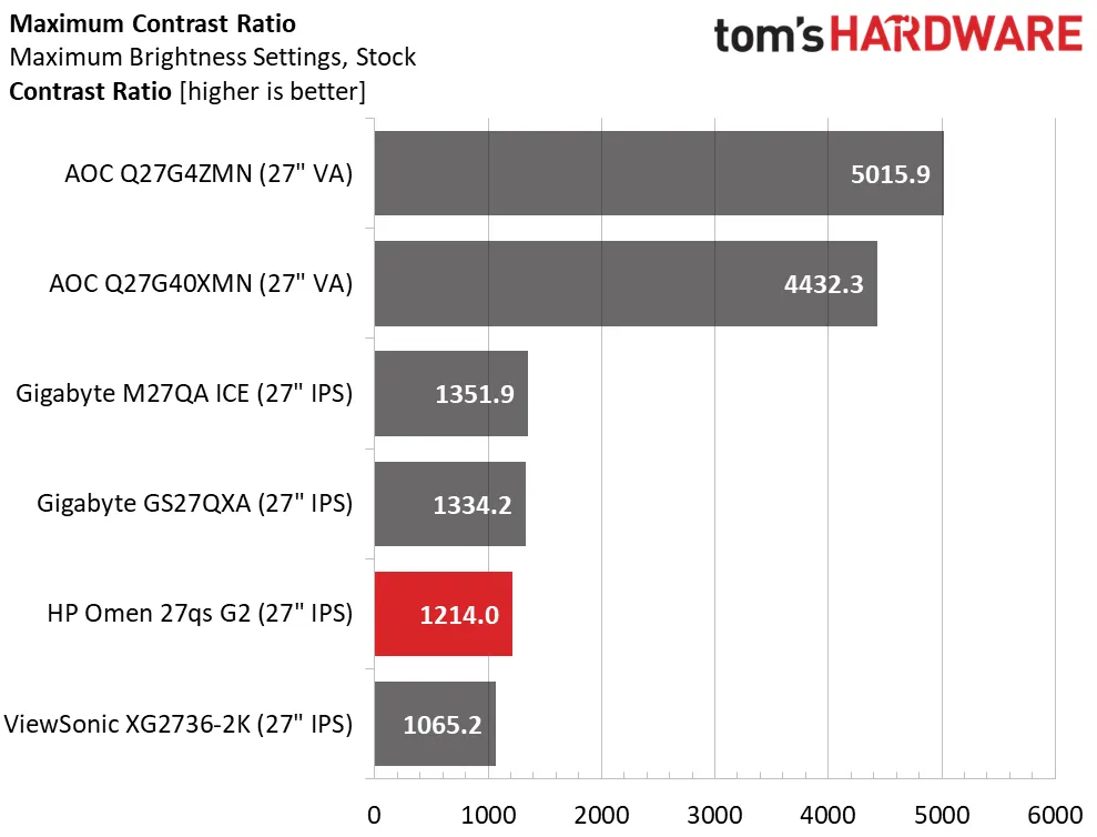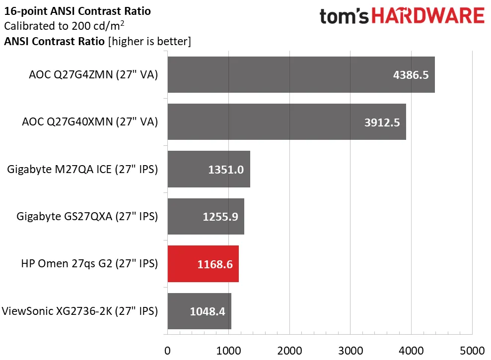 После калибровки контрастность практически не меняется, колебания незначительны. Omen 27qs G2 уверенно превосходит средний для IPS-матриц показатель 1000:1, но его конкуренты от Gigabyte немного выигрывают по глубине черного цвета. Если ваша цель — максимальная контрастность на ЖК-экране, технология VA по-прежнему остается лучшим выбором.