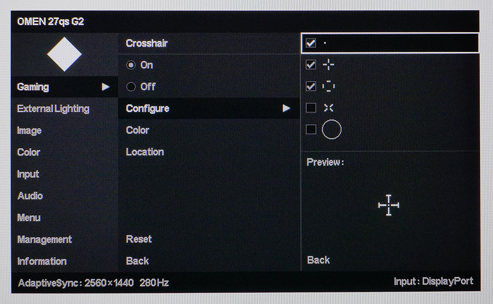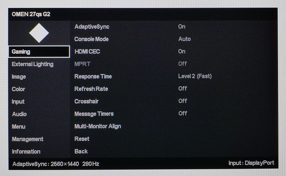 Экранное меню Omen 27qs G2 открывается нажатием на джойстик. Оно простое и лаконичное: черный фон, белые буквы, никакой лишней графики. Меню разделено на девять разделов.