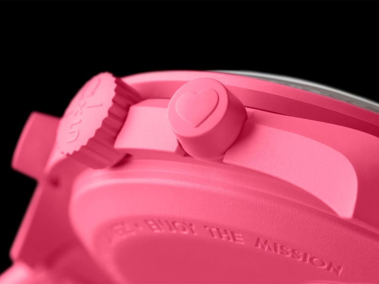 Как и OMEGA x Swatch MoonSwatch «Миссия в фазу супер-синей луны», «Миссия в фазу розовой луны» оснащена функцией хронографа и индикатором фазы луны на дополнительном циферблате в положении «2 часа». На этот раз он выполнен в черном и серебристо-розовом опаловом цвете с двумя розовыми лунами, которые светятся розовым Super-LumiNova в темноте и вращаются под серебристо-розовой опаловой маской.