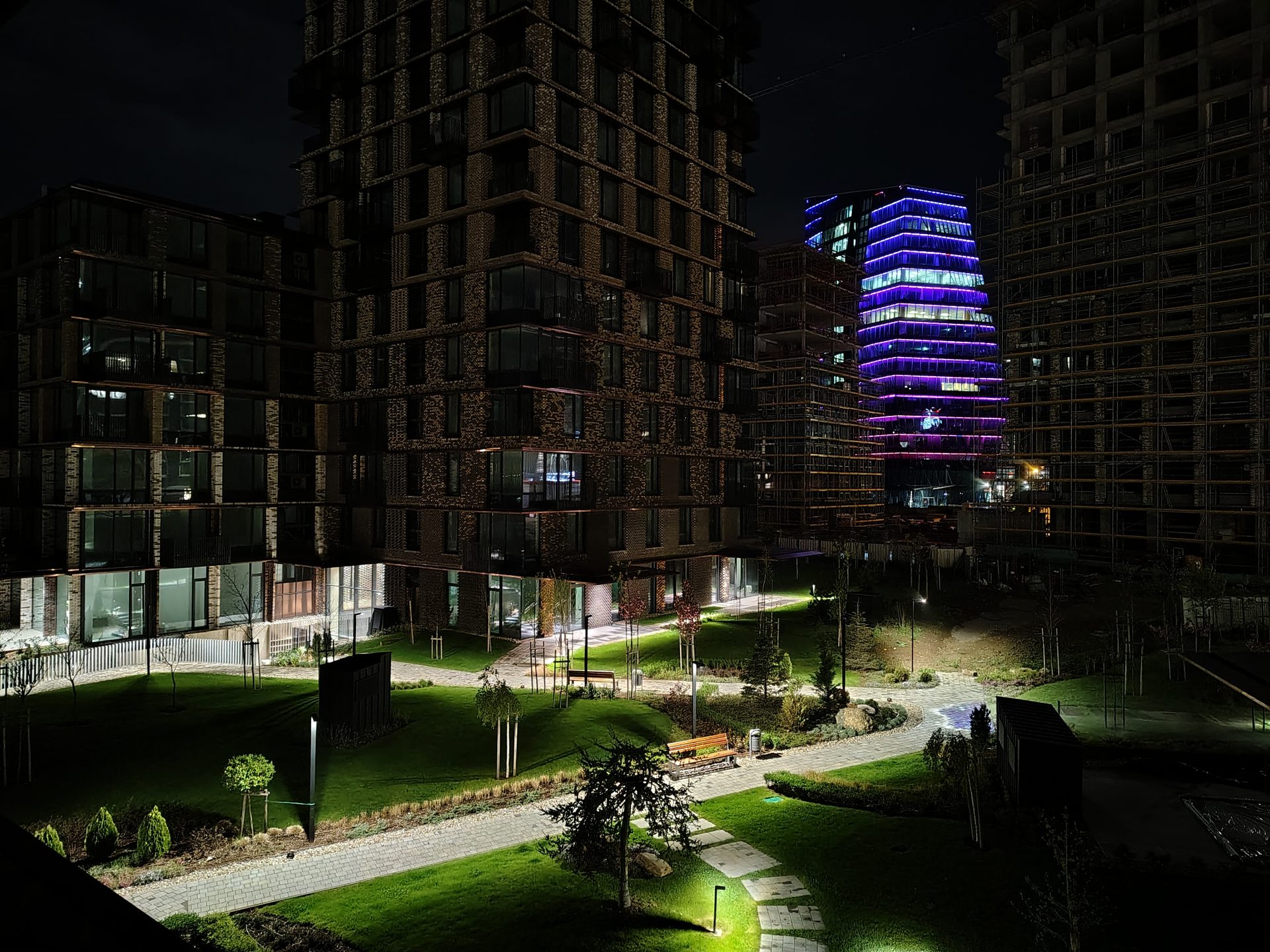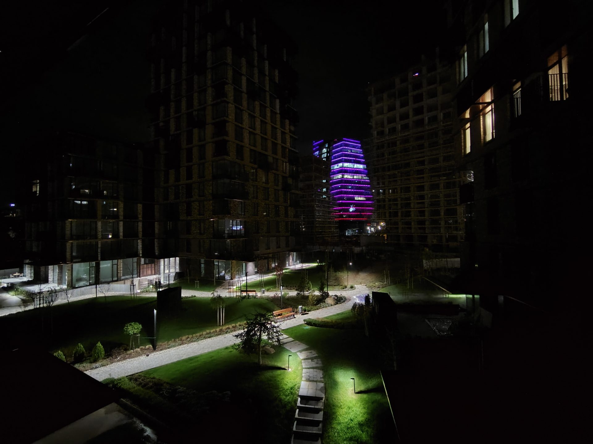 Ночью телефон снимает неплохо, но чудес ждать не стоит. Экспозиция и цвета отрабатывают хорошо, однако деталям не хватает четкости, а вокруг ярких объектов появляются ореолы. Отдельный ночной режим ситуацию не спасает — автоматика и так выжимает из матрицы максимум. С зумом ночью лучше не экспериментировать вовсе.
