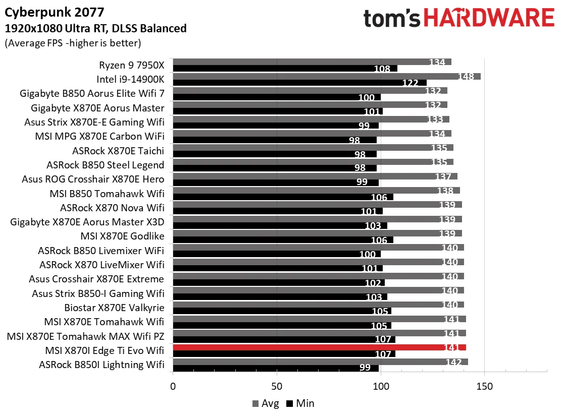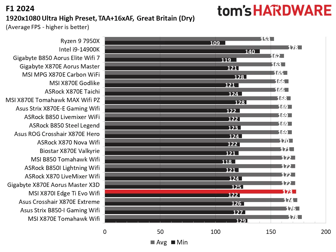 Производительность в играх оказалась одной из лучших, которые мы видели в реальных играх. В Cyberpunk она показала самые высокие минимальные значения и вторую по скорости среднюю частоту кадров (107 и 141 соответственно). В F1 24 результаты были аналогичными, с хорошими минимальными и средними показателями частоты кадров. В целом, материнская плата MSI демонстрирует очень хорошие результаты в самых разных задачах.