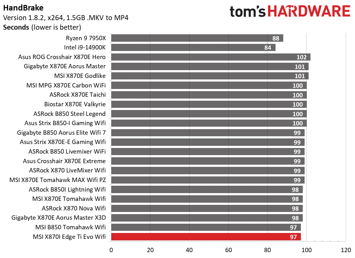 Наши результаты в тестах на время также оказались хорошими: наша доска показала отличные результаты в Handbrake (заняв первое и второе места по скорости) и средние результаты в тестах Corona и LAME. В этих тестах тоже все хорошо!