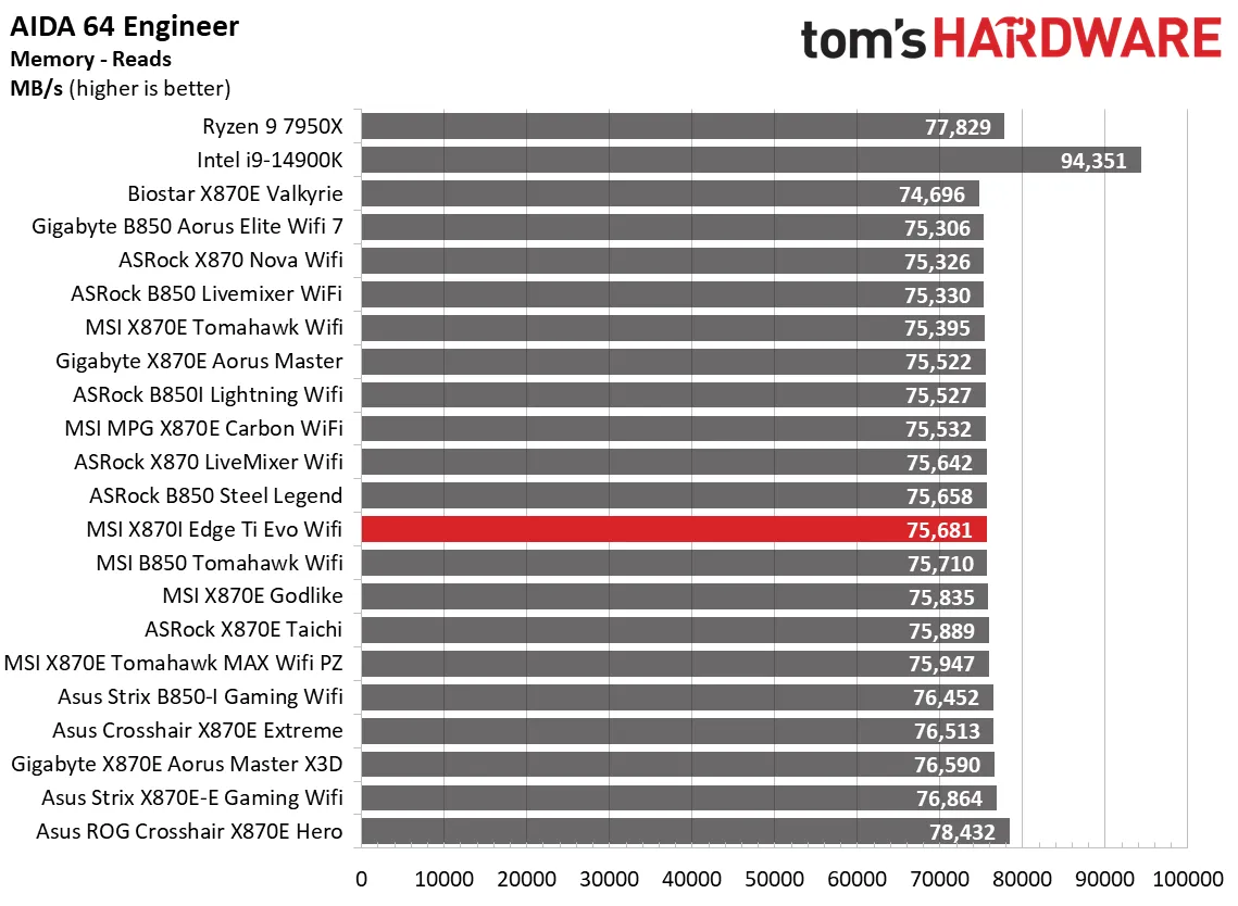 Результаты тестирования памяти подтвердили прежнюю закономерность: наш комплект Klevv DDR5-8000 загрузился в Windows и запустил тест пропускной способности памяти AIDA64, но не прошёл стресс-тест. Как известно, это уже далеко за пределами оптимального соотношения цены и производительности, и наш комплект не входит в список совместимых модулей памяти MSI, поэтому мы не могли ожидать от него работоспособности. Комплект TeamGroup DDR5-7200 работал как положено, как и наш комплект Kingston DDR5-6000, который мы используем для базового тестирования (он капризничал на последних материнских платах ASRock).