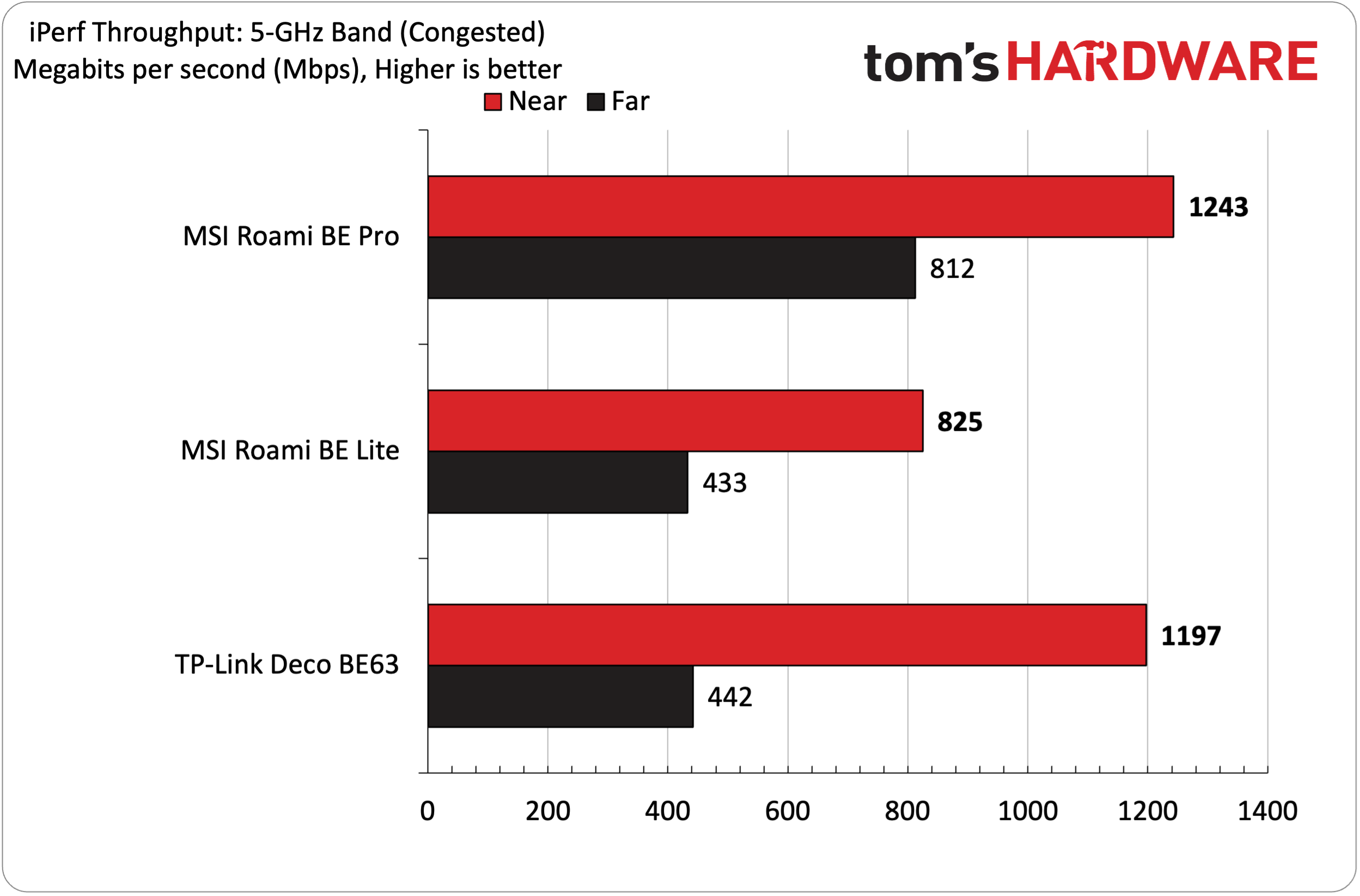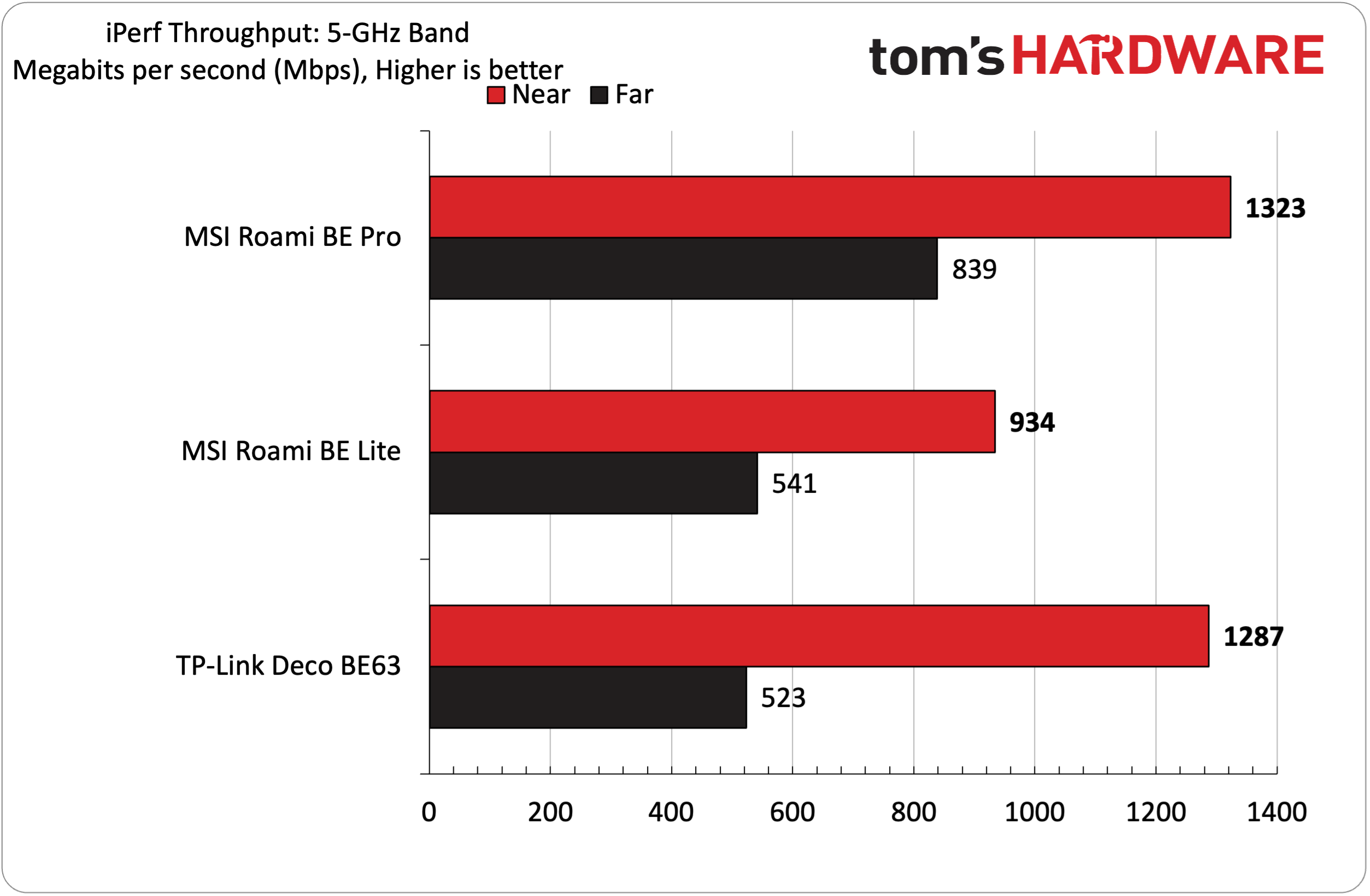 В диапазоне 5 ГГц Roamii BE Pro снова продемонстрировал стабильность. Он превзошёл Deco BE63 на коротком расстоянии (1323 Мбит/с против 1287 Мбит/с) и показал меньшее падение скорости на большом (839 Мбит/с против 523 Мбит/с). Производительность Roamii BE Pro в этом диапазоне также оказалась лучше, чем у его двухдиапазонного аналога, Roamii BE Lite.