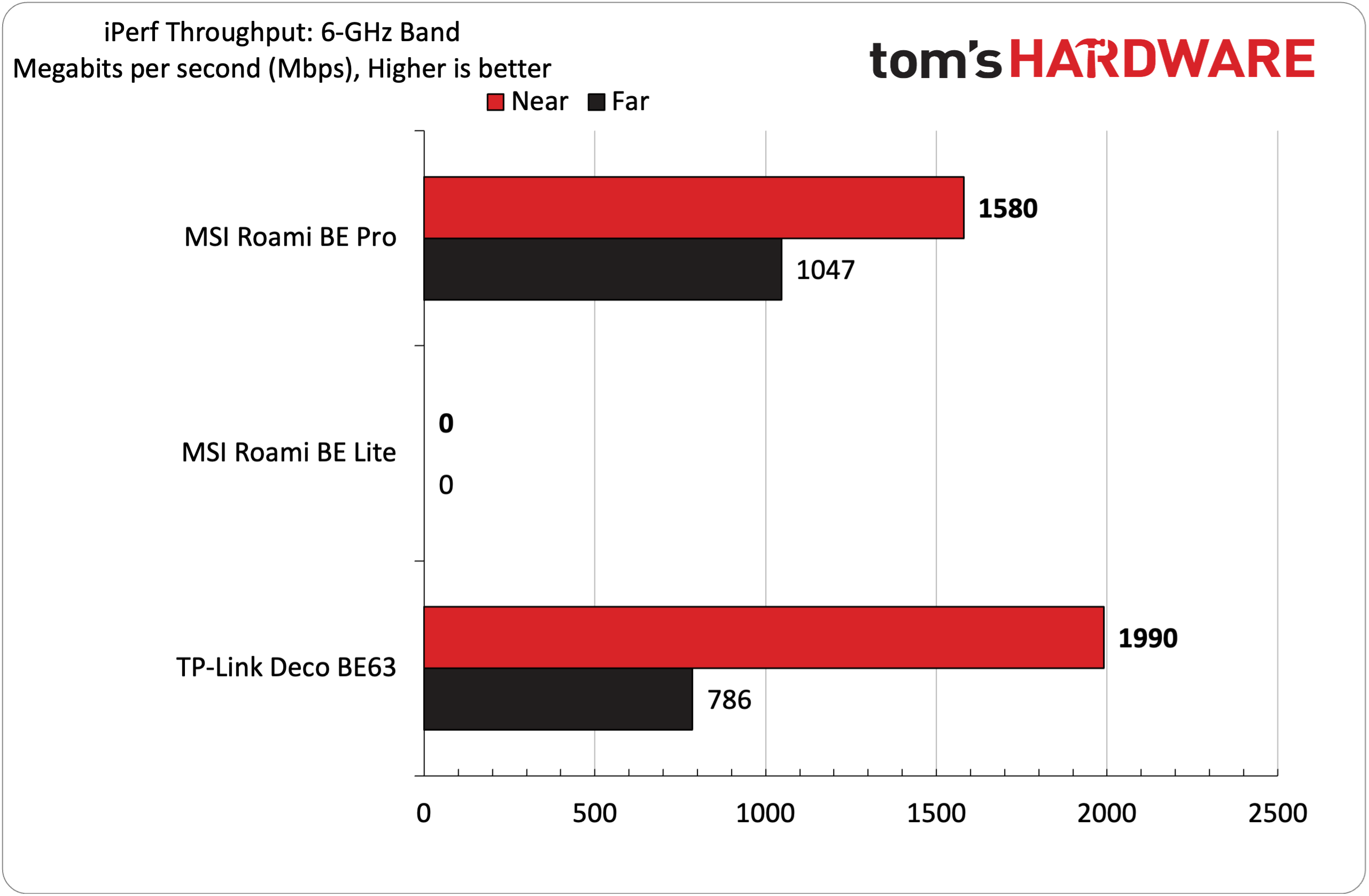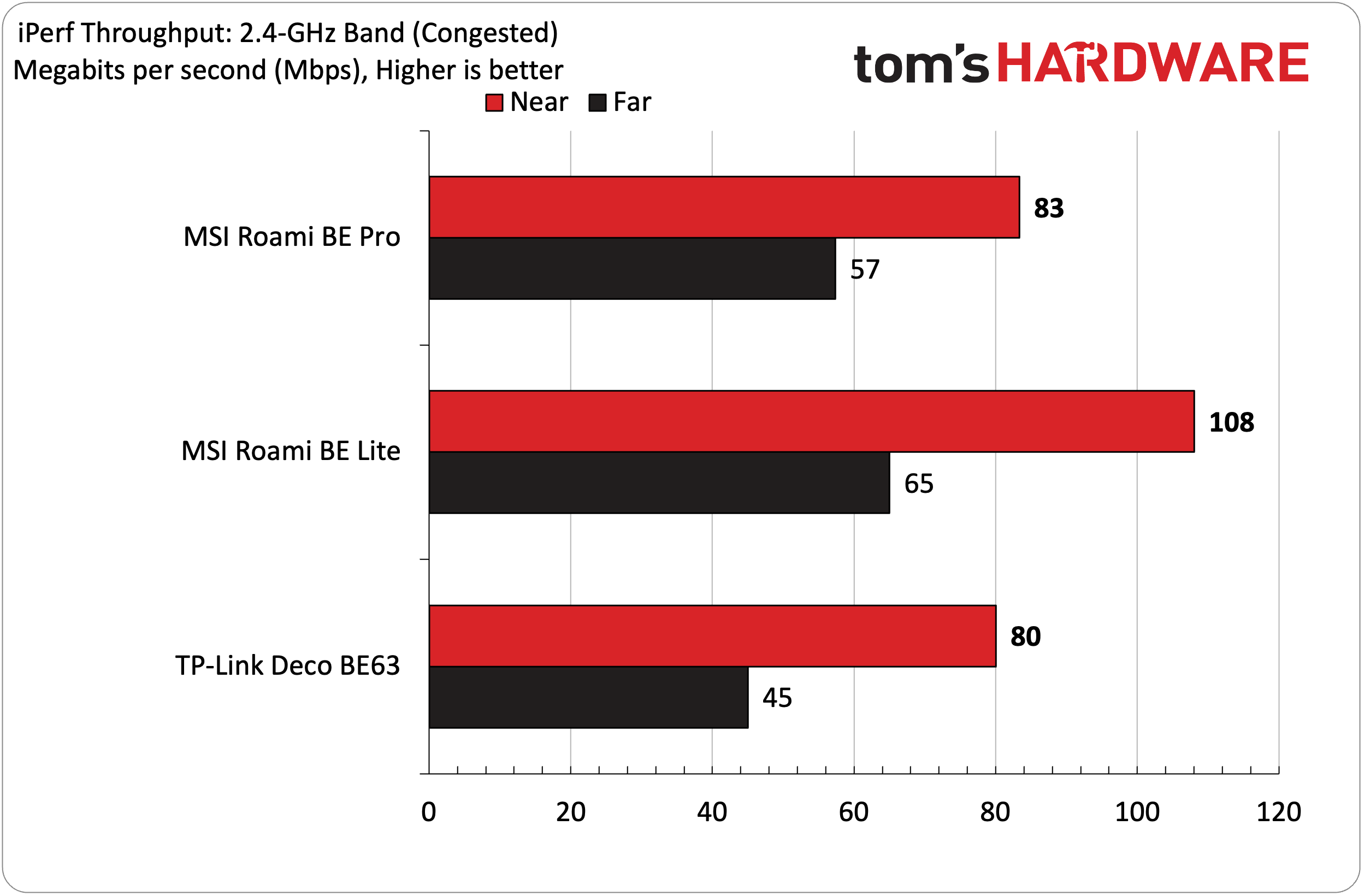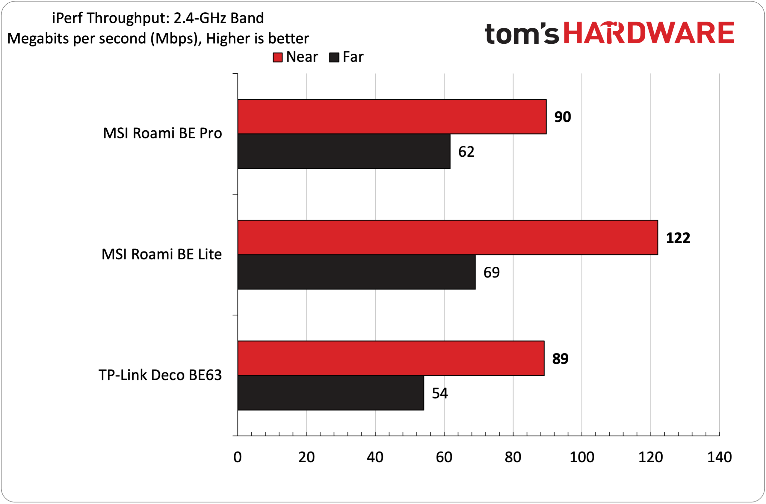 В диапазоне 2,4 ГГц Roamii BE Pro снова опередил Deco BE63, хотя и с небольшим отрывом. Интересно, что Roamii BE Lite фактически занял первое место на обоих расстояниях.