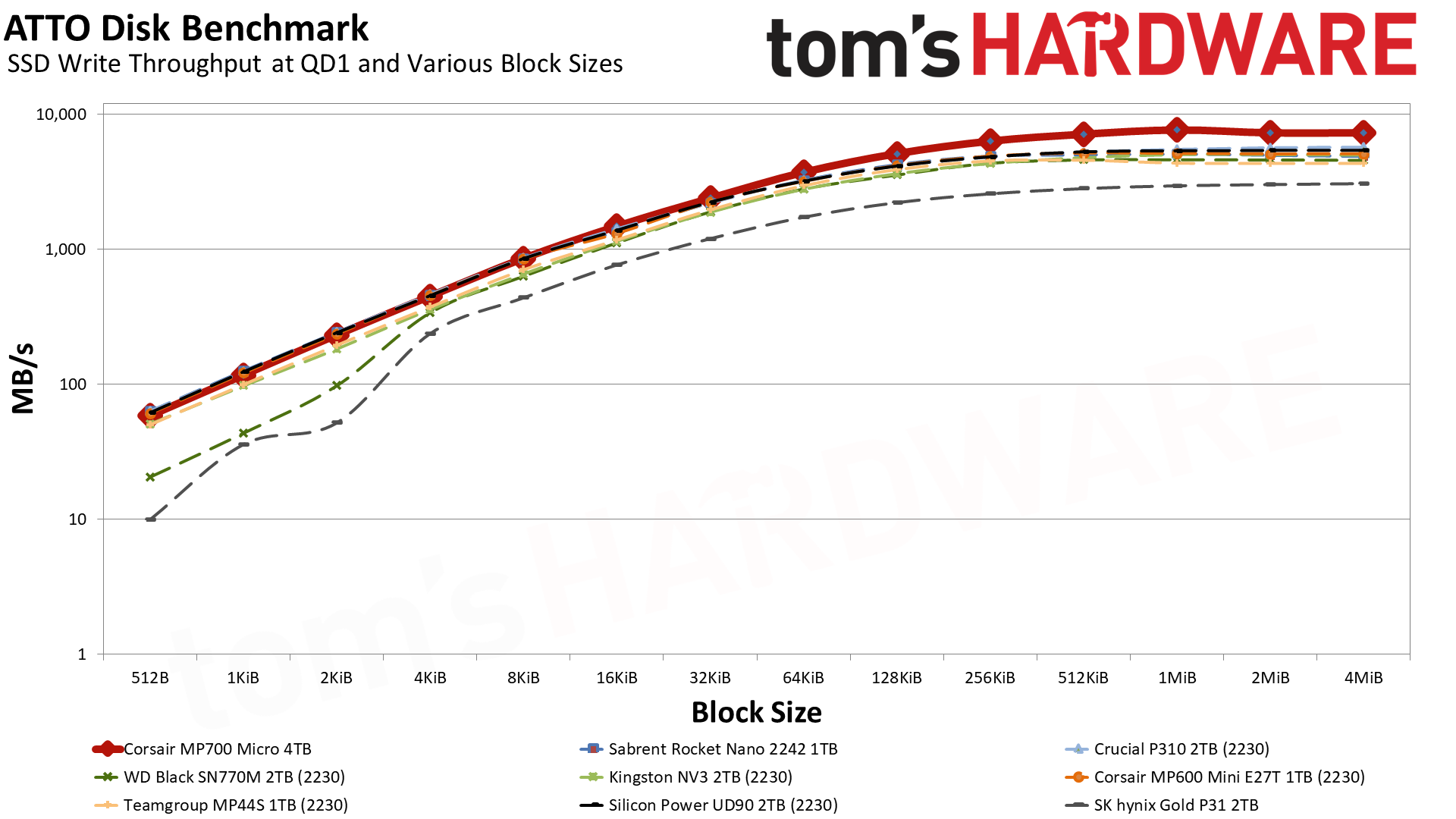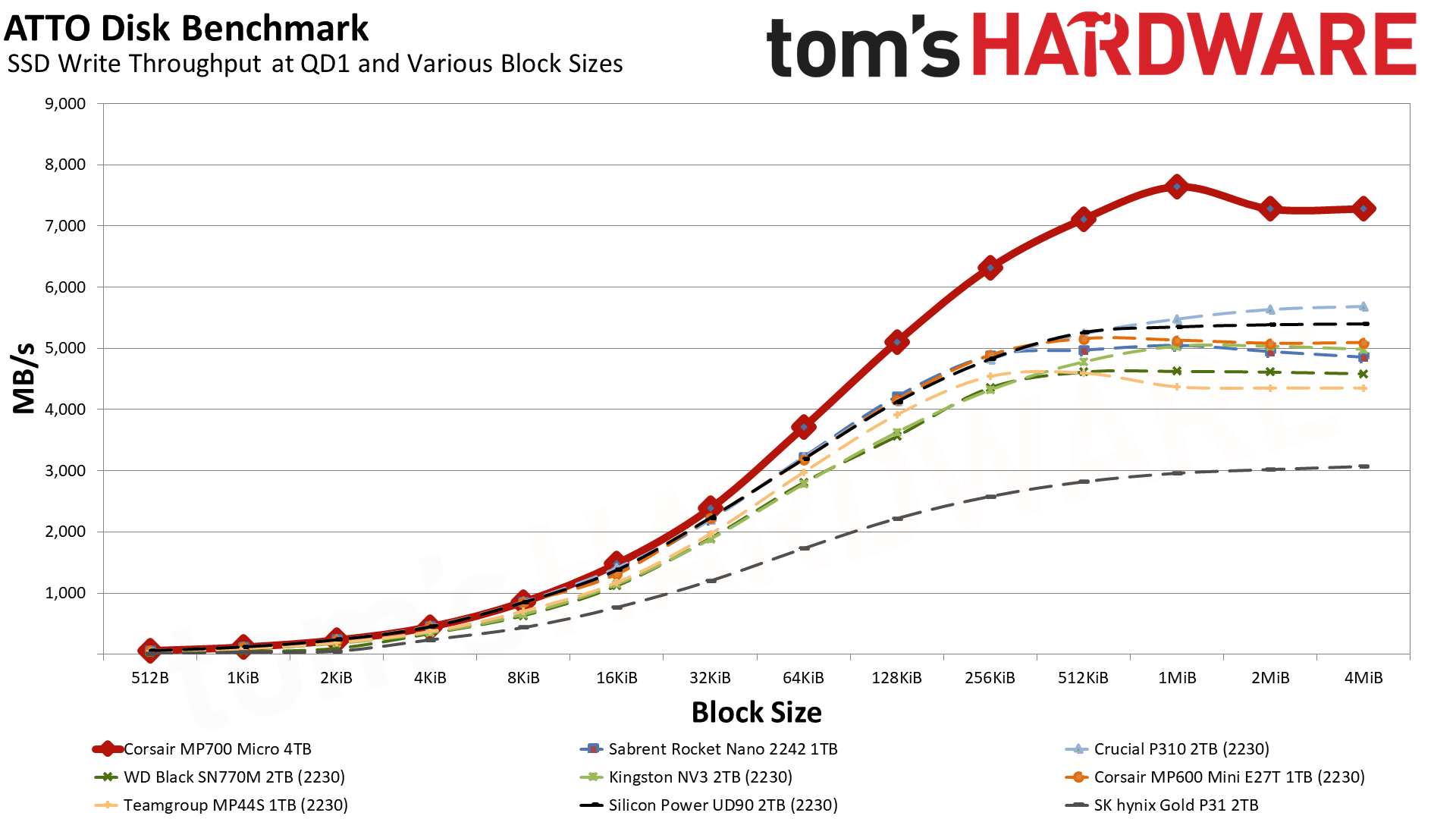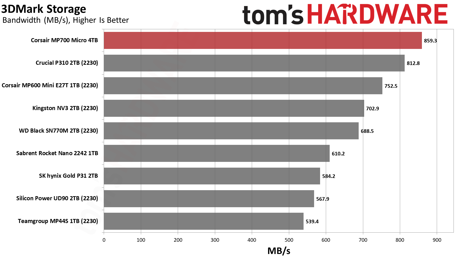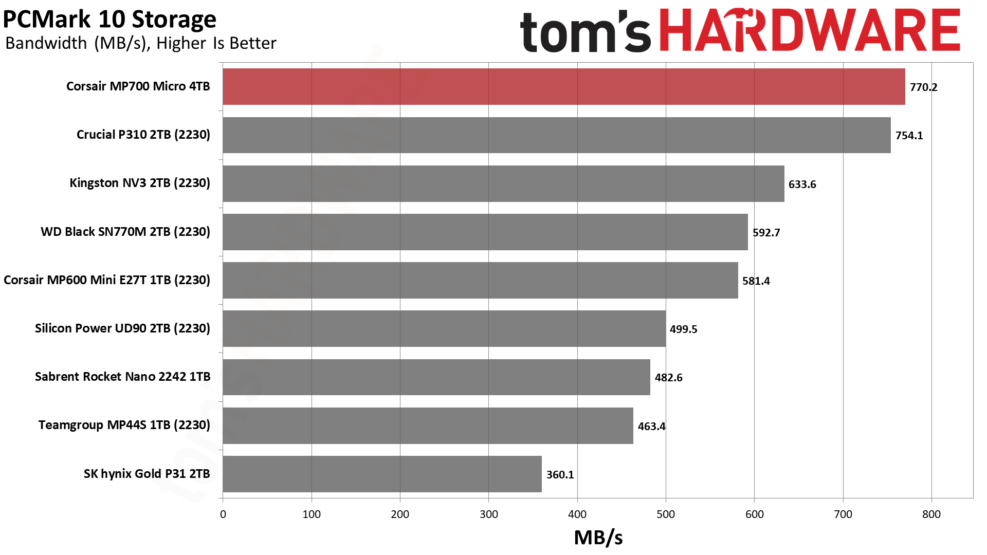 MP700 Micro обеспечивает невероятно высокую пропускную способность для своего класса. Crucial P310 тоже хорош, но с уходом Crucial с потребительского рынка освободилась ниша для компактных дисков, где MP700 Micro сейчас является явным фаворитом.