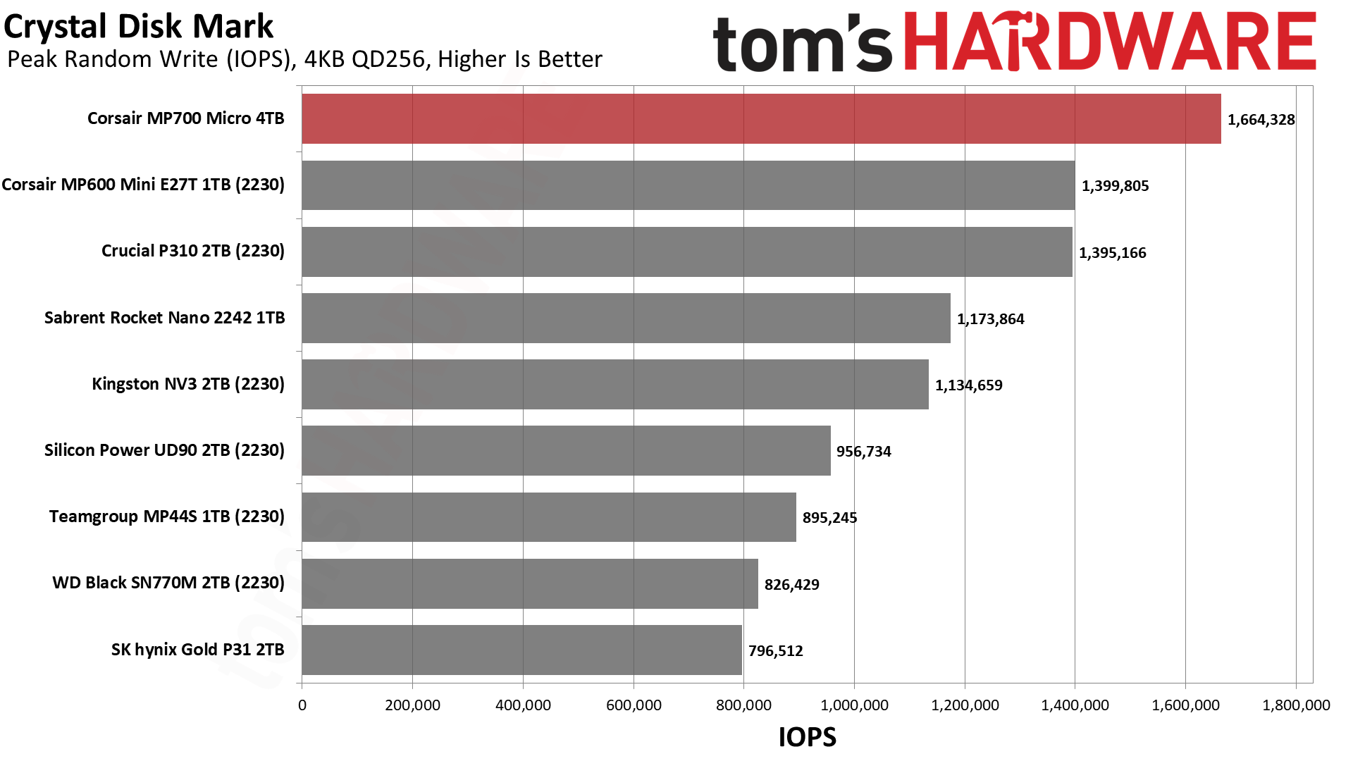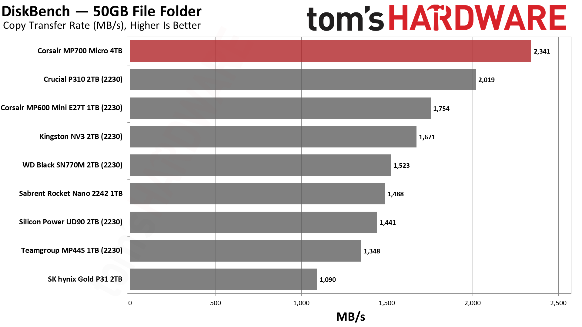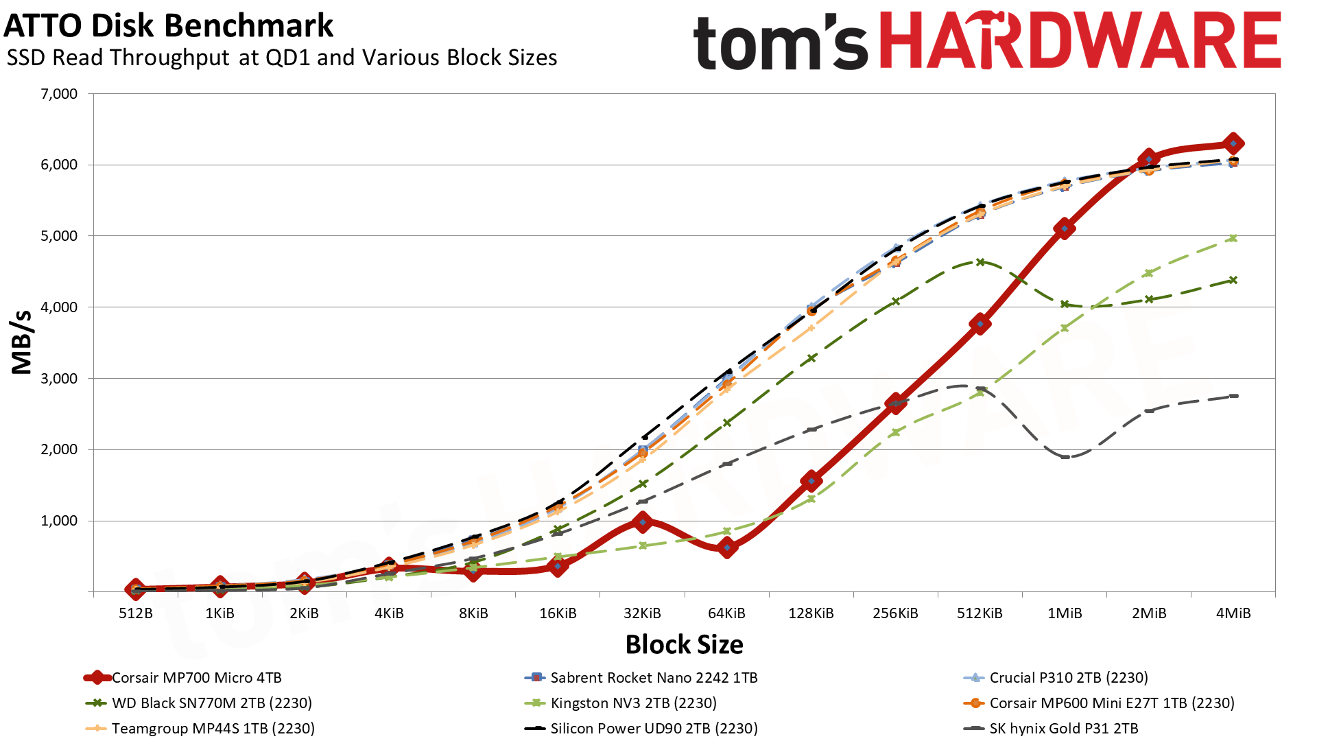 MP700 Micro обеспечивает невероятно высокую пропускную способность для своего класса. Crucial P310 тоже хорош, но с уходом Crucial с потребительского рынка освободилась ниша для компактных дисков, где MP700 Micro сейчас является явным фаворитом.