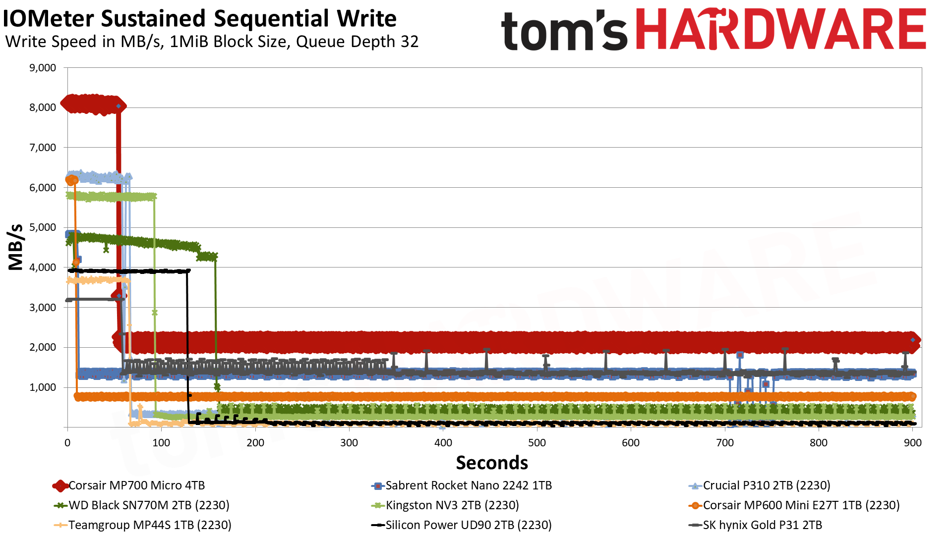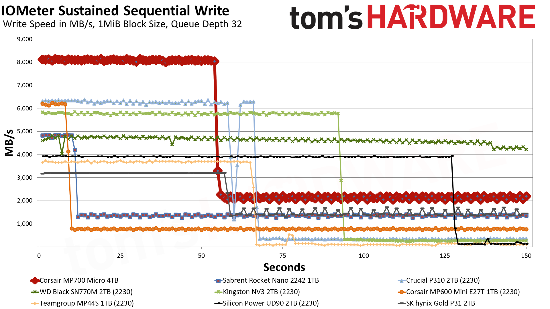 Если скептики еще остались, то их критика наверняка подтвердится в ходе нашего теста на длительную запись. Использование большого pSLC-кэша — отличный способ скрыть низкую производительность даже в крайних случаях, и хотя в реальных условиях обычно нет причин беспокоиться о производительности после кэширования, мы считаем, что на это стоит обратить внимание. Это может стать ахиллесовой пятой для накопителей, которые в остальном показывают хорошие результаты, поэтому разумнее подождать результатов этого теста. Учитывая это, мы рады сообщить, что MP700 Micro здесь не разочаровывает.
