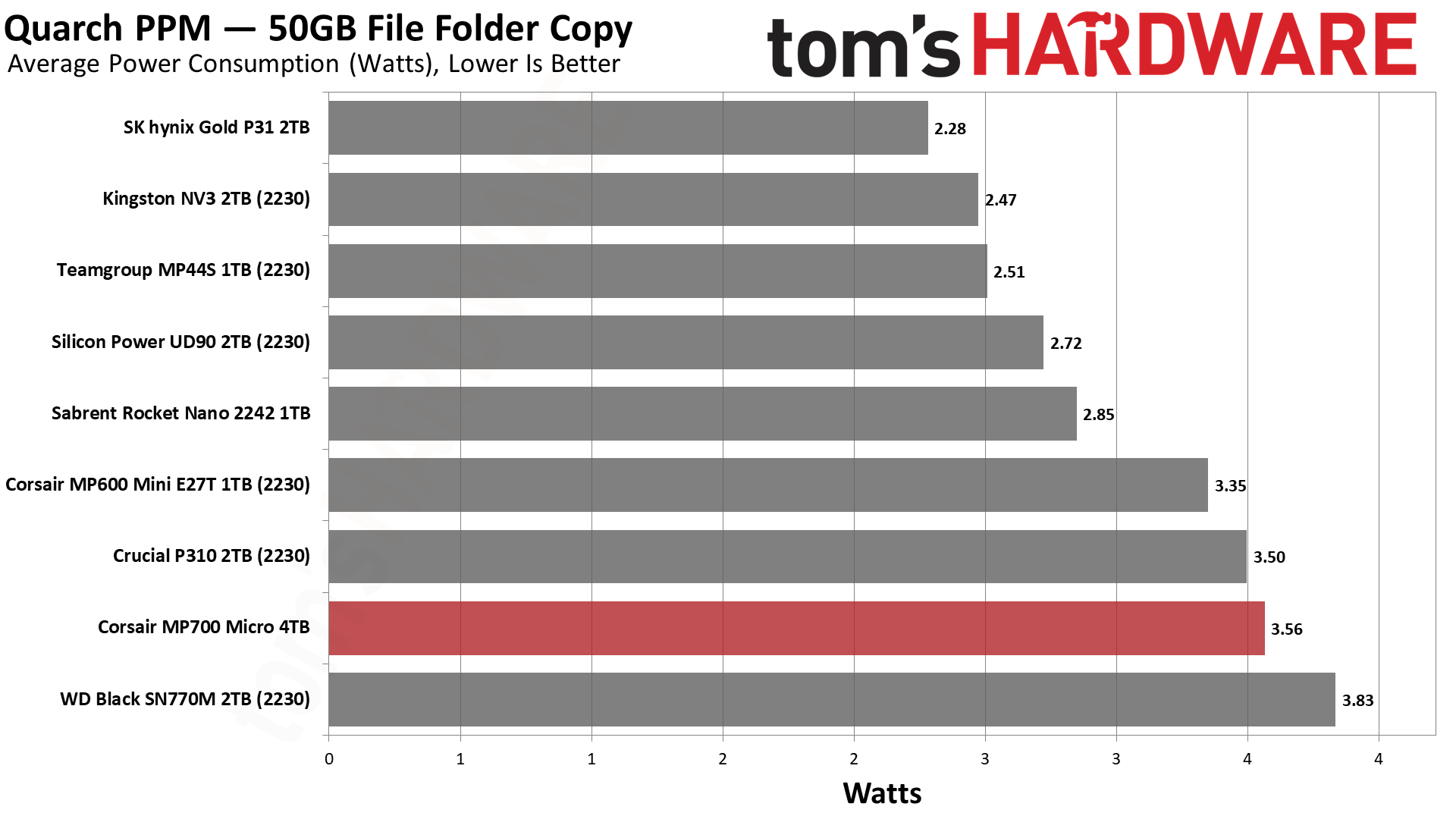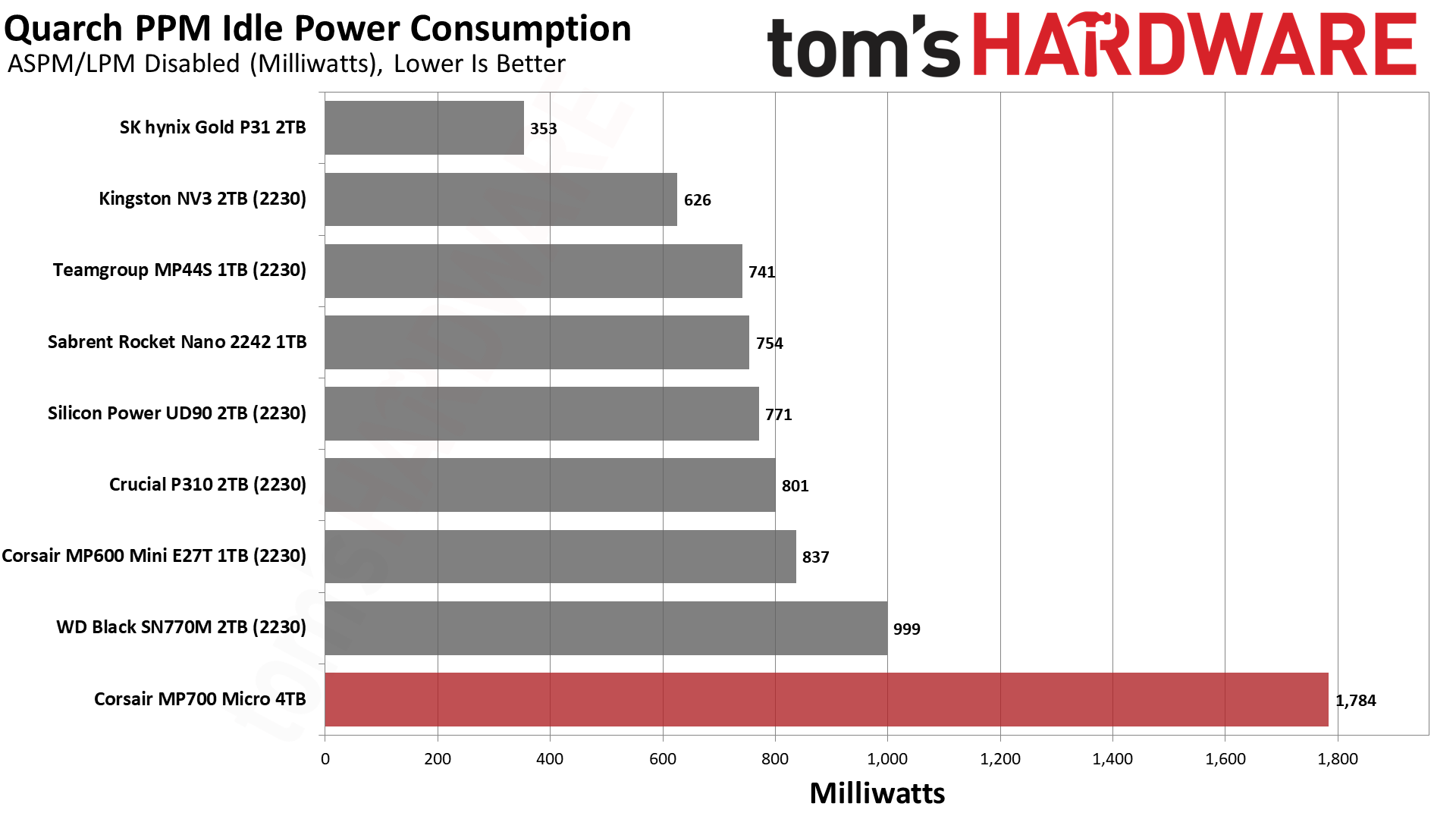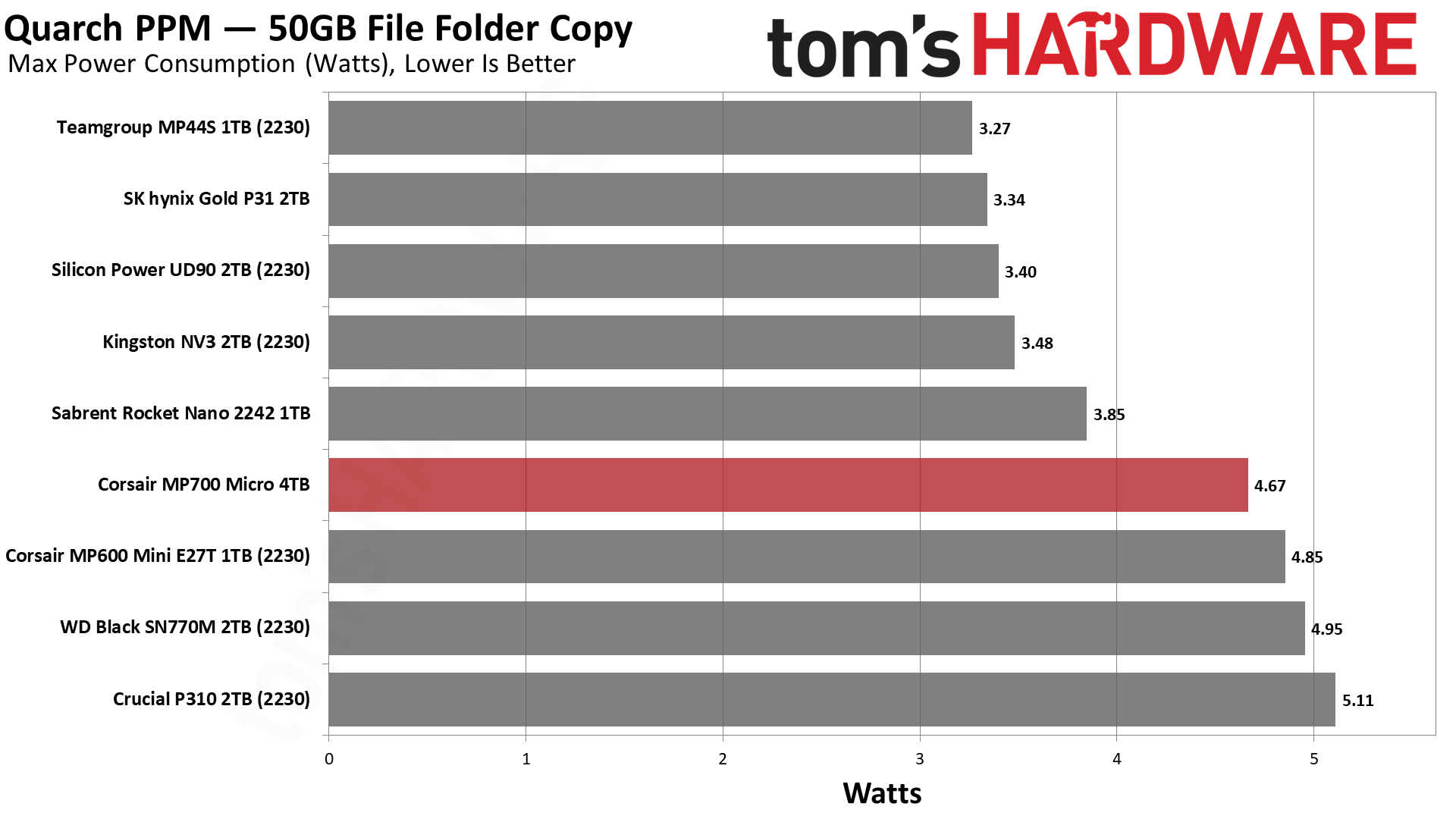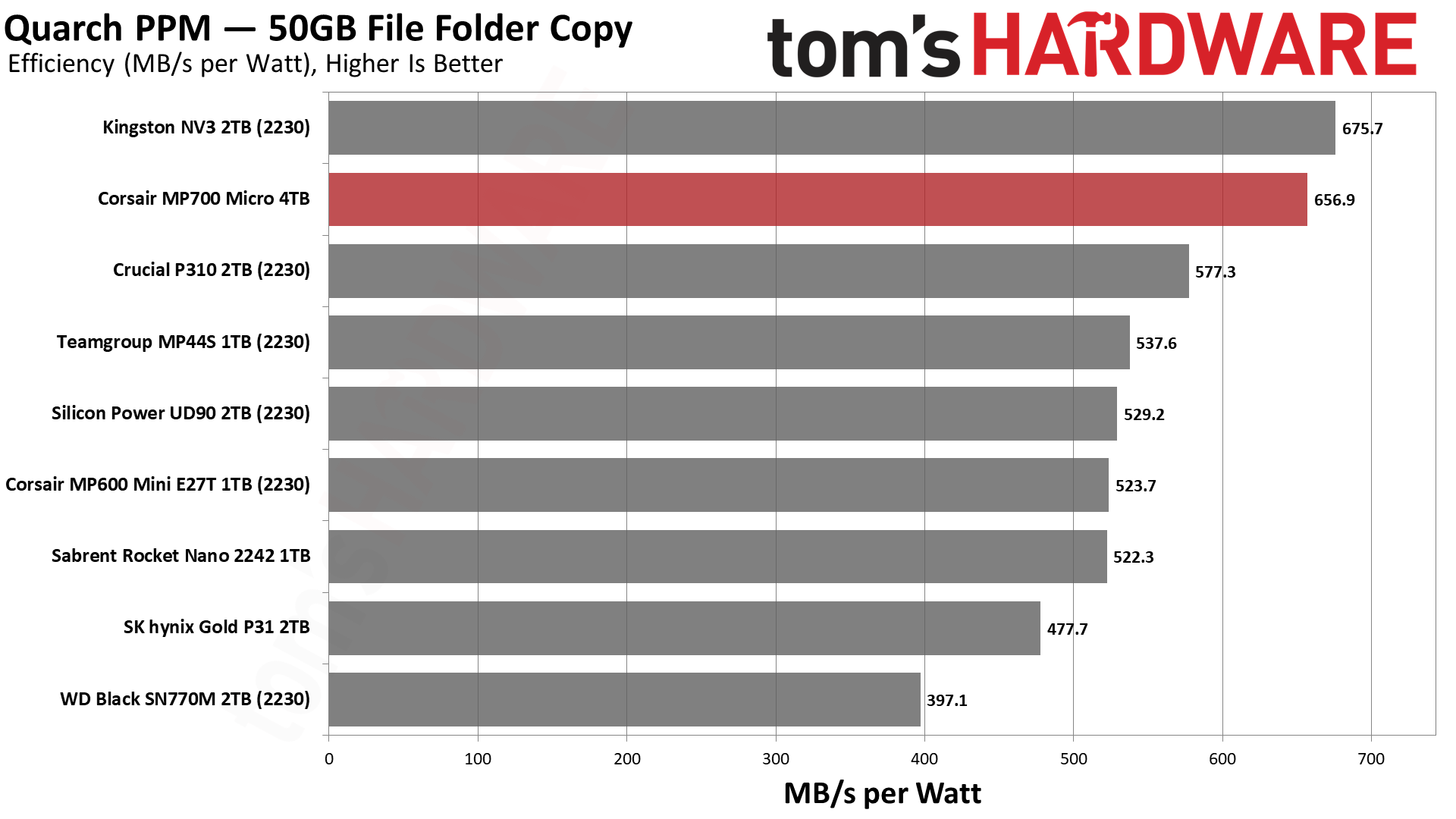 Накопитель MP700 Micro очень энергоэффективен и работает относительно тихо. В наших сегодняшних тестах он занимает второе место по энергоэффективности, но следует помнить, что он будет еще эффективнее, если будет работать на более низкой скорости интерфейса. В прямом сравнении он должен превзойти любой из протестированных нами накопителей.