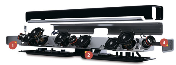 Playbar оборудован тремя комплектами динамиков (для левого, правого и центрального каналов), а также излучает звук с торцов корпуса.