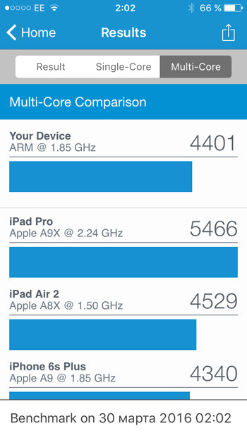Так, тест Geekbench 3, разработанный для оценки производительности основного процессора, показал превосходство iPhone SE над iPhone 5s на 74 процента в многоядерном тесте multi-core и на 81 процент — в одноядерном single-core. Как ни странно, по результатам iPhone SE опередил и iPhone 6s plus (2 процента в одноядерном и 1,5 процента в многоядерном тесте).
