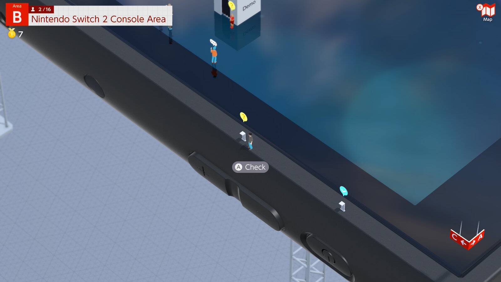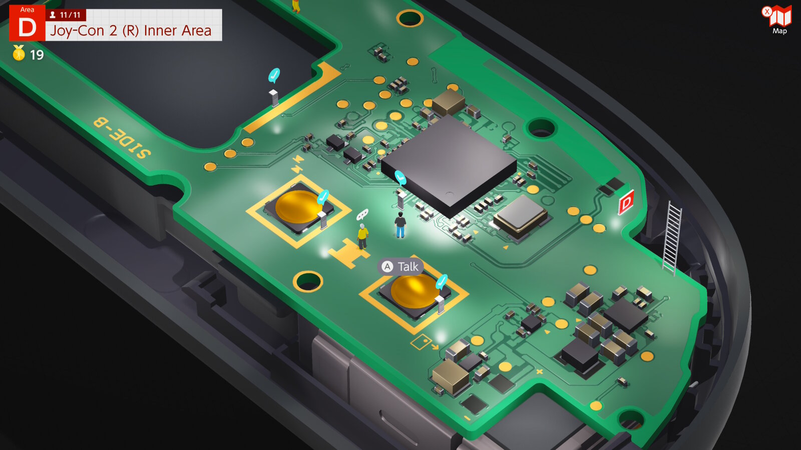 Нельзя сказать, что в Switch 2 Welcome Tour совсем нет шарма, особенно когда вы прогуливаетесь по огромным контроллерам Joy-Con 2 или спускаетесь внутрь, чтобы изучить их устройство. Когда вы добираетесь до самого устройства и идете по сенсорному экрану, это похоже на катание на коньках, и ваш аватар даже поскользнется и упадет, если бежать слишком долго.