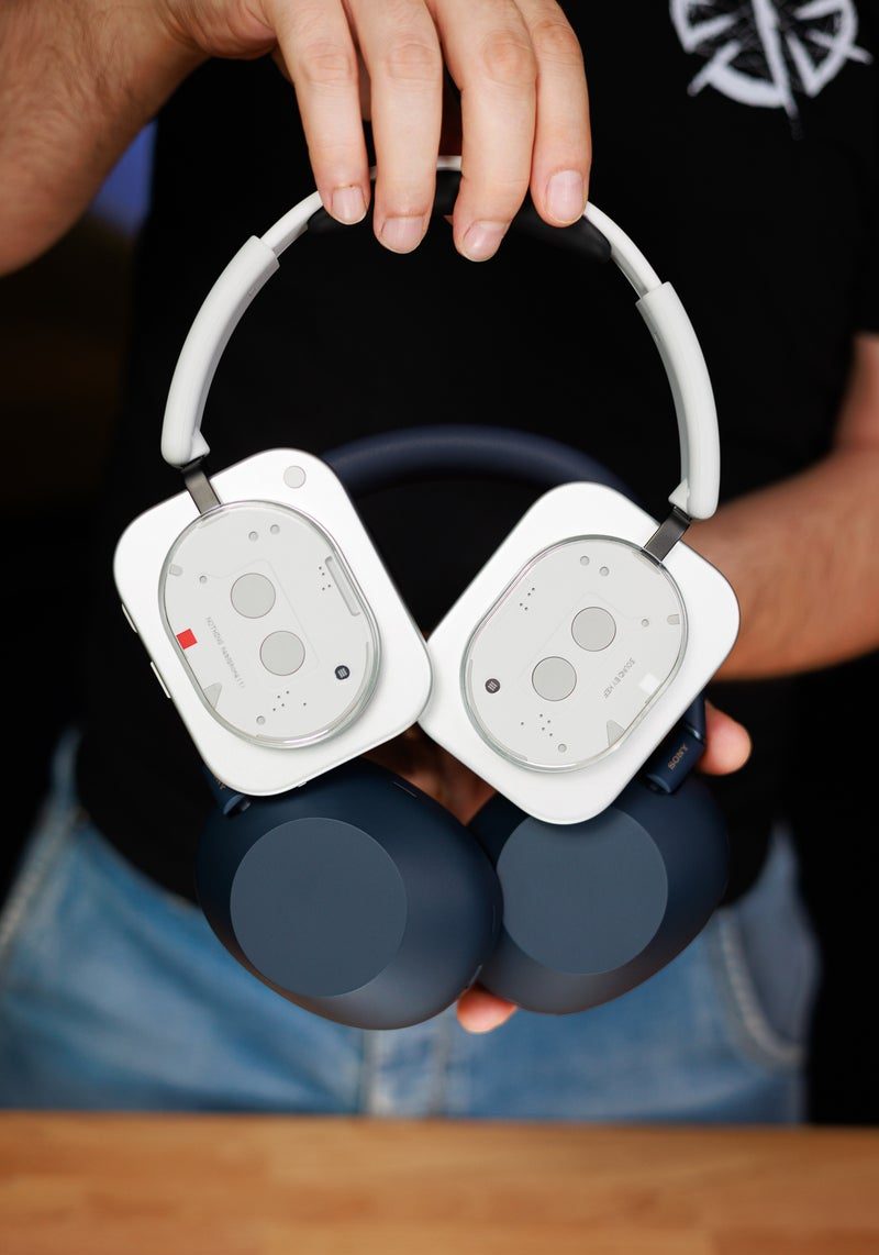 Мы уже упоминали варианты расцветки — выбор здесь не очень большой. Наушники Sony доступны в серебристом, черном или синем цвете, который представлен на наших фотографиях. Nothing Headphone (1) бывают либо белыми, как у нас, либо черными.