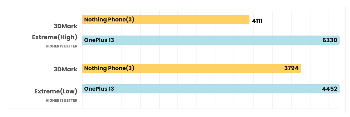 То же самое относится к графическому стресс-тесту 3DMark Extreme, в котором OnePlus 13 уверенно обходит своего конкурента Nothing.