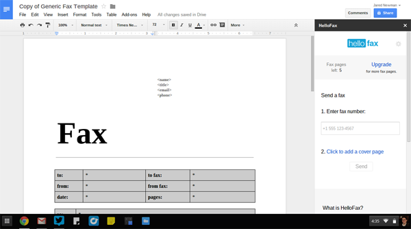 В тех редких случаях (хочется в это верить), когда вам нужно отправить факс, предлагаемый способ поможет избежать похода на почту. Расширение Hello Fax позволяет отправлять документы по факсу непосредственно из Документов Google. Здесь есть даже встроенная форма для оформления. Правда, бесплатно сервис позволяет отправить только пять страниц. Отправка последующих обойдется вам в 99 центов за лист. Можно также оформить подписку, стоимость которой составляет от 10 долл. в месяц.