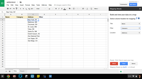 Расширение Mapping Sheets отображает на Картах Google выбранный список адресов. Данные на карте можно фильтровать по категориям, как указано в электронной таблице. На первый взгляд, этот инструмент кажется не особенно полезным, но ему можно придумать множество потенциальных применений, начиная от демонстрации на карте оптимального маршрута доставки и заканчивая графическим представлением всех мест, где вам довелось побывать.
