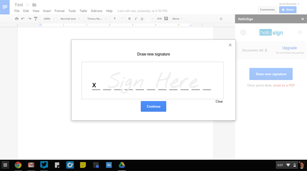 Диск Google предлагает несколько способов создания электронной подписи, самым простым из которых является расширение Hello Sign. Нарисуйте свой автограф в поле, предназначенном для ввода подписи, и просто перетащите его в Документ Google. Если вы занимаетесь сбором подписей, можно добавить соответствующее поле к документу на сайте Hello Sign и отправить его по электронной почте. Бесплатно в течение месяца разрешается вставить подписи в три документа. За 15 долл. в месяц это ограничение снимается.