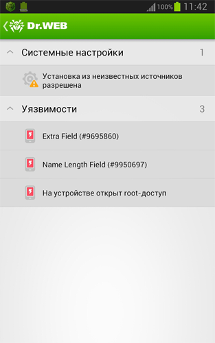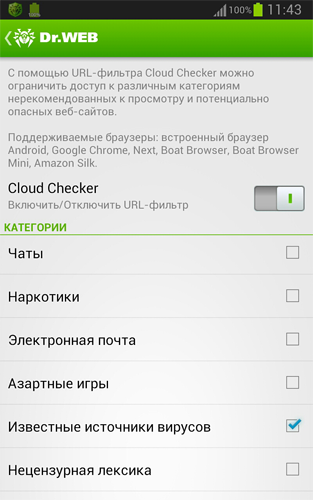 Интересным новшеством стала возможность разлочки смартфонов, полностью заблокированных вредоносными приложениями. Эта возможность присутствует и в бесплатной версии Dr.Web для Android Light 7.00.14 – достаточно подключить девайс к зарядному устройству и энергично его встряхнуть, при этом несистемные процессы завершат свою работу. Таким образом, Dr.Web может справиться даже с теми блокировщиками, которых нет в вирусной базе.