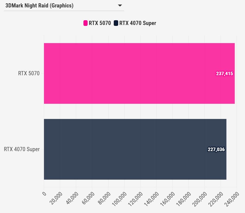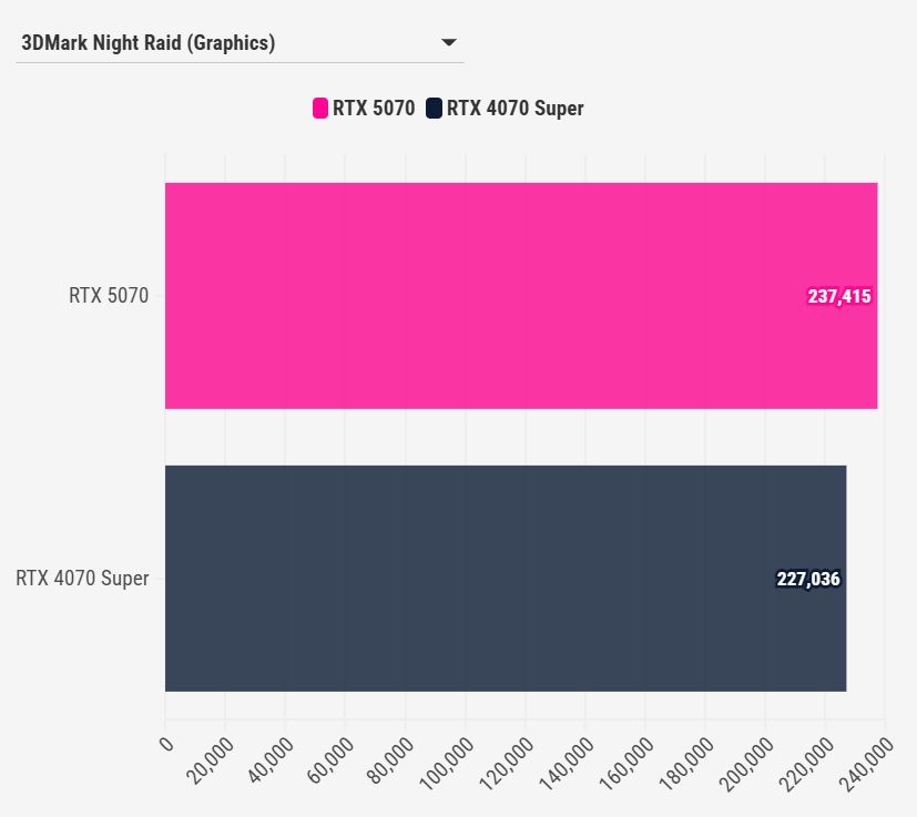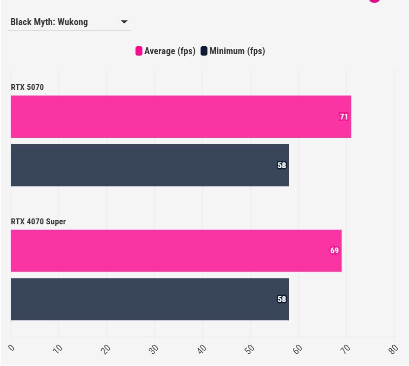 При максимальных настройках Cyberpunk 2077 5070-я модель выдаёт 106 кадров в секунду, в то время как RTX 4070 Super — 92 кадра в секунду (улучшение на 15,2%), демонстрируя дополнительное преимущество видеопамяти GDDR7. В некоторых играх практически нет улучшений, что можно заметить, сравнив RTX 5070 с RTX 4070 Super в Civilization VII (средняя частота кадров 204 кадра в секунду против 202 кадров в секунду) и Dying Light 2 (150 кадров в секунду против 142 кадров в секунду). Увеличение составило 1% и 5% соответственно.