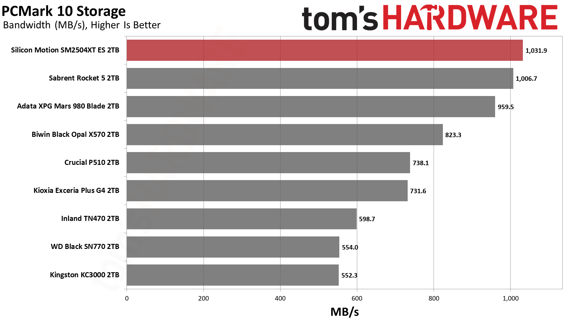 Такая же политика применялась к нашему предварительному образцу SMI SM2508, и в конечном счете это не имело особого значения. В SM2508 ES использовалась память BiCS6, тогда как в современных розничных накопителях используется более совершенная BiCS8 или 232/276-слойная флэш-память TLC от Micron; розничные версии показали себя даже лучше. С другой стороны, вполне вероятно, что флэш-память в SM2504XT уже современная, поэтому наши результаты тестов этого инженерного образца должны быть близки к тому, что мы увидим в магазинах.