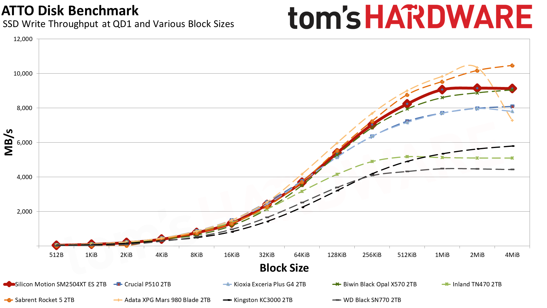 SM2504XT ES снова занимает первое место в своей группе, хотя на этот раз конкуренты подобрались ближе. Sabrent Rocket 5 по-прежнему значительно опережает его, и мы видим, что Adata Legend 980 Blade также находится на близком расстоянии. Последний использует контроллер SMI SM2508 с DRAM и 232-слойной памятью Micron TLC (более старая технология). Технологии контроллеров схожи, что может дать подсказку о типе используемой памяти.