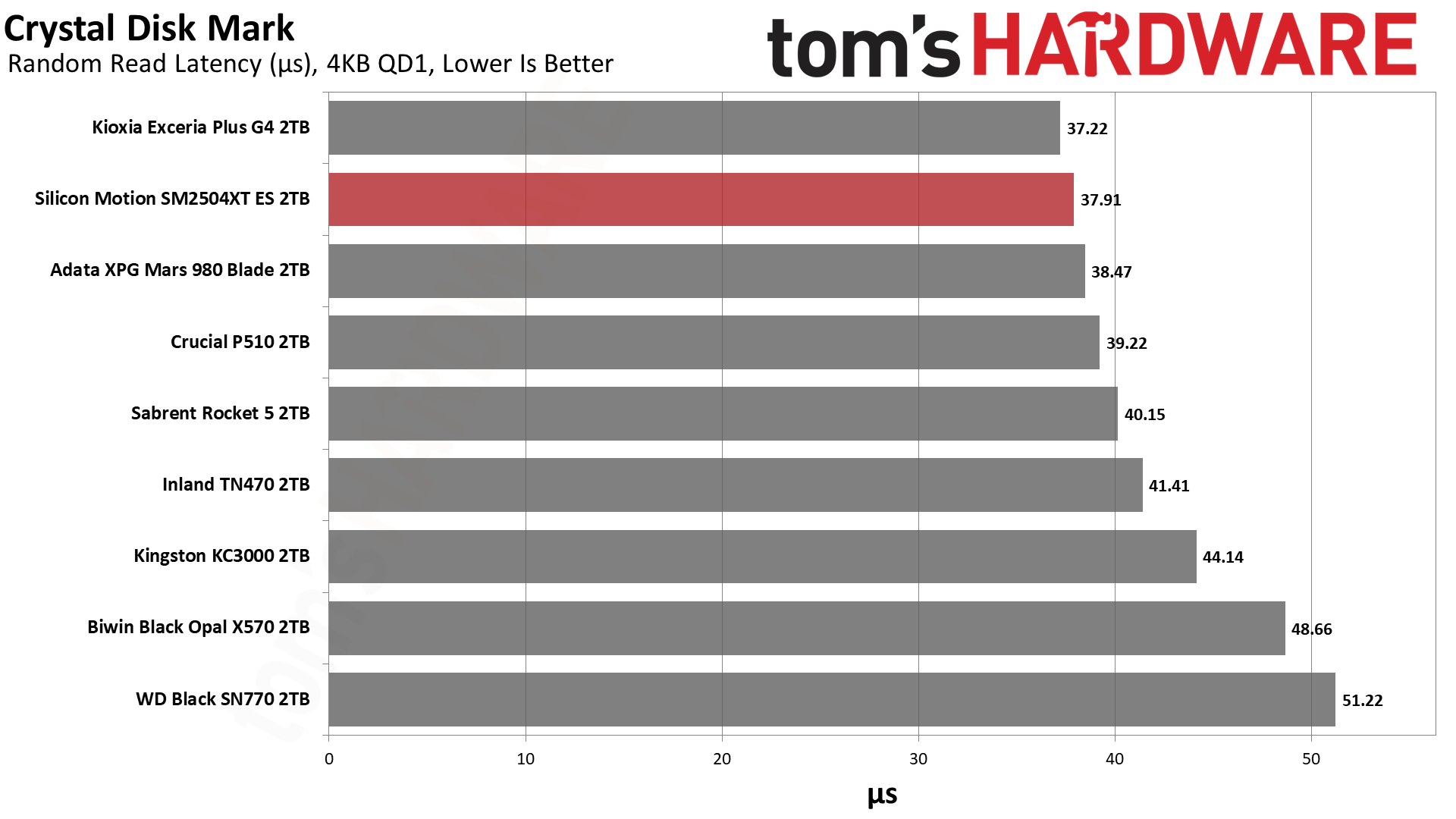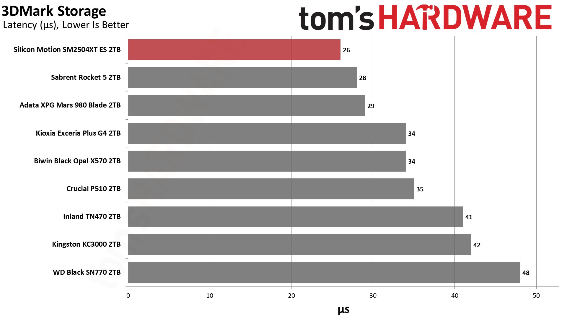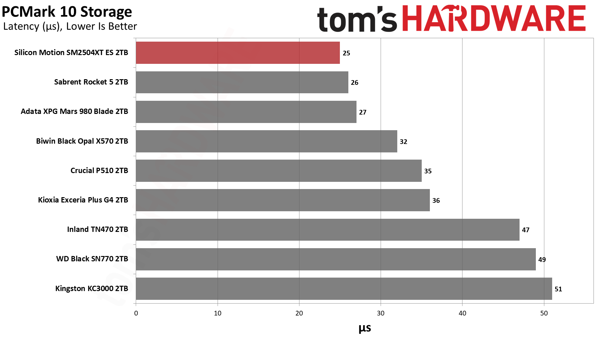 Тем не менее, уместно упомянуть об этом здесь, поскольку одним из преимуществ SN8100 является его фантастически низкая задержка, и SM2504XT, который теоретически не должен конкурировать с флагманами, демонстрирует здесь весьма впечатляющие результаты.