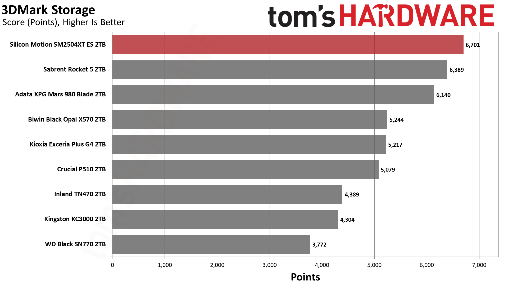 SM2504XT ES занял первое место в нашем тесте 3DMark, немного опередив даже топовый Sabrent Rocket 5. Его результат не так хорош, как у рекордсмена Sandisk WD_Black SN8100, но вполне сопоставим с некоторыми лучшими дисками Crucial. Это косвенно указывает на то, что флеш-память в этом диске может быть 232- или 276-слойной Micron TLC, или, как альтернатива, Kioxia/Sandisk BiCS8 TLC, но мы не будем делать окончательных выводов.