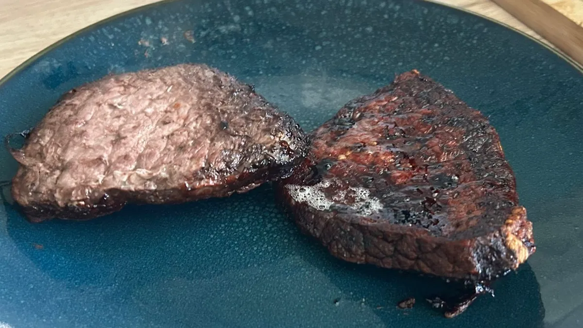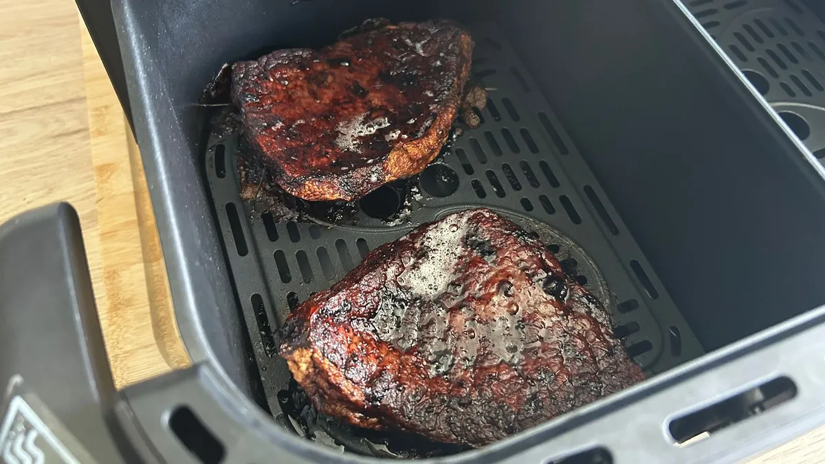 Но не каждое тестирование продуктов проходило так удачно, и я обнаружил, что многие из моих проблем сводились к тому, что таблицы продуктов были недостаточно подробными. Меня всегда интригует предустановка для стейка в аэрофритюрнице, и я еще не нашел такой, которая бы давала качество, сравнимое со сковородой. У Philips 1000 Series есть предустановка «Стейк», но таблица продуктов дает только приблизительный вес стейка и не рекомендует тип стейка для приготовления или является ли рекомендуемый вес (150-200 г) весом одного стейка или общим весом. Я выбрал два стейка-медальона общим весом 340 г и добавил их в одну корзину.