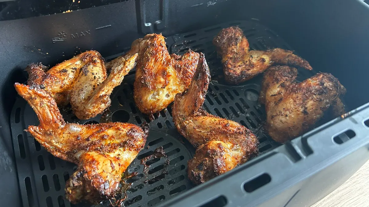 Результаты для куриных крылышек и кексов были, пожалуй, лучшими из тех, что я когда-либо получал в аэрофритюрнице. В XXL-кастрюлю я добавил шесть полноразмерных крылышек, покрытых сухой приправой «Луизиана», и выбрал предустановку «Куриные голени» (в таблицах продуктов нет рекомендаций по куриным крылышкам).