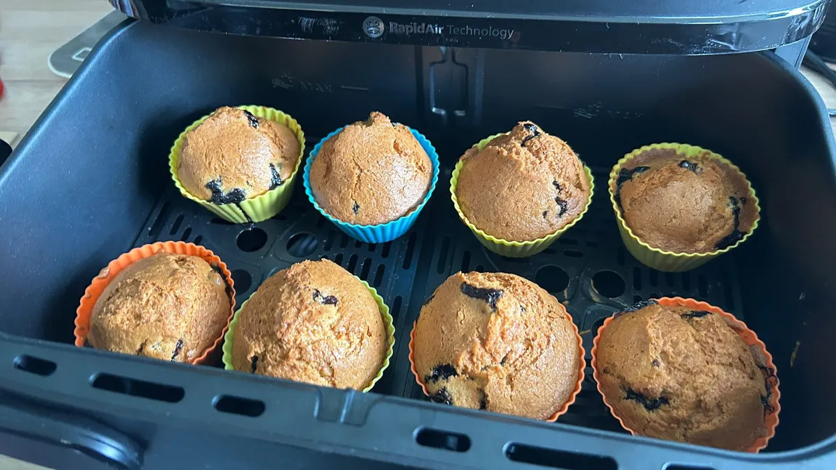 Кроме переворачивания крылышек по сигналу, я не вносил никаких изменений, и в результате крылышки получились идеально хрустящими снаружи и сочными внутри, без перебора в ту или иную сторону. Аналогично, использование рецепта кексов с черникой и лимоном от Ninja (простите, Philips) с предустановкой «Маффин» в XXL-корзине привело к идеальным кексам: мягким и пышным внутри, но не слишком сухим.
