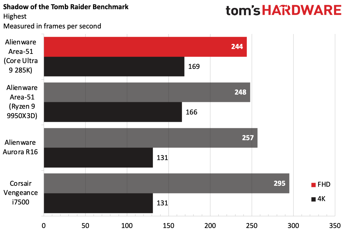 В бенчмарке Shadow of the Tomb Raider на максимальных настройках Intel Area-51 показал 244 FPS при разрешении 1080p и 169 FPS при разрешении 4K, в то время как версия от AMD показала практически идентичные результаты. Как Aurora, так и Vengeance превзошли конкурентов при разрешении 1080p, но Area-51 выиграл в разрешении 4K.
