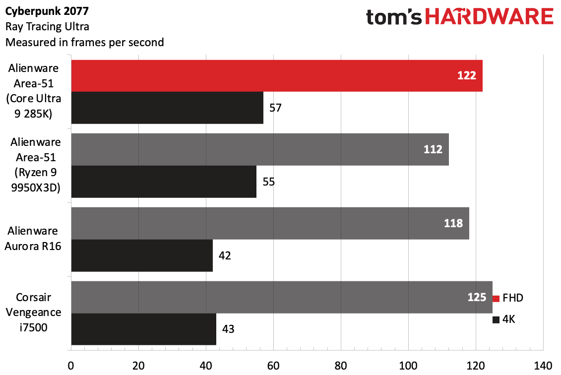 В Cyberpunk 2077 с ультравысокими настройками трассировки лучей результаты были ближе. Area-51 достиг 122 FPS, всего на 3 кадра отставая от Vengeance. Здесь система Ryzen показала худший результат — 122 FPS при разрешении 1080p, но примерно такой же результат в разрешении 4K.