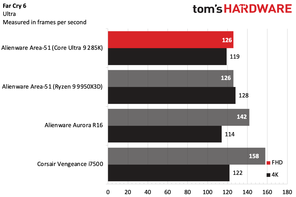 Far Cry 6 — игра, сильно нагружающая процессор, и тест Ultra снова показал игровые ограничения Core Ultra 9 285K. В разрешении 4K видеокарта 4090 в корпусе Corsair даже немного превзошла Intel Area-51 с её 5090. Но лучший результат показала Area-51 на базе Ryzen, достигнув 127 FPS в разрешении 4K.
