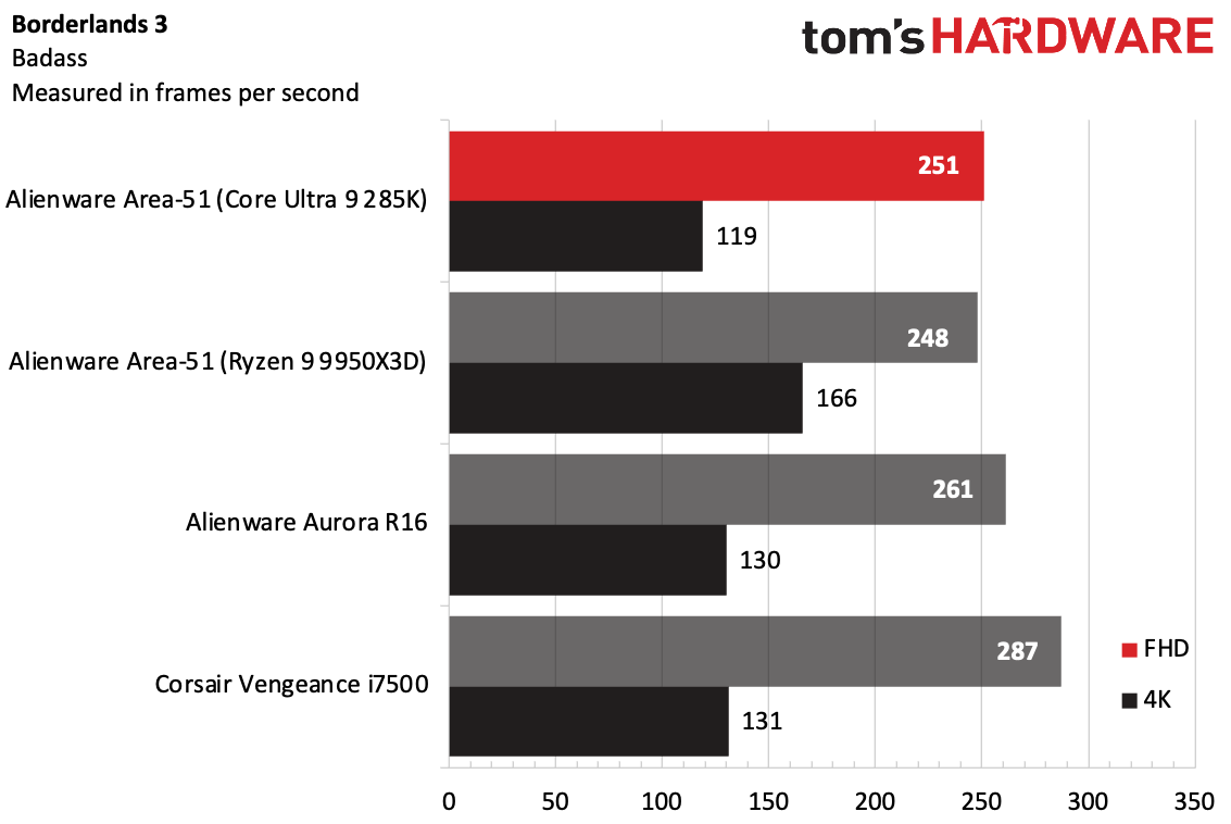В Borderlands 3, еще одной ресурсоемкой игре, Ryzen Area-51 вырвался вперед в разрешении 4K, достигнув 166 FPS. Но версия на базе Intel снова отстала от Aurora и Vengeance. 251 FPS в разрешении 1080p и 119 FPS в разрешении 4K — это неплохие результаты, но все же медленнее, чем у более старых устройств.