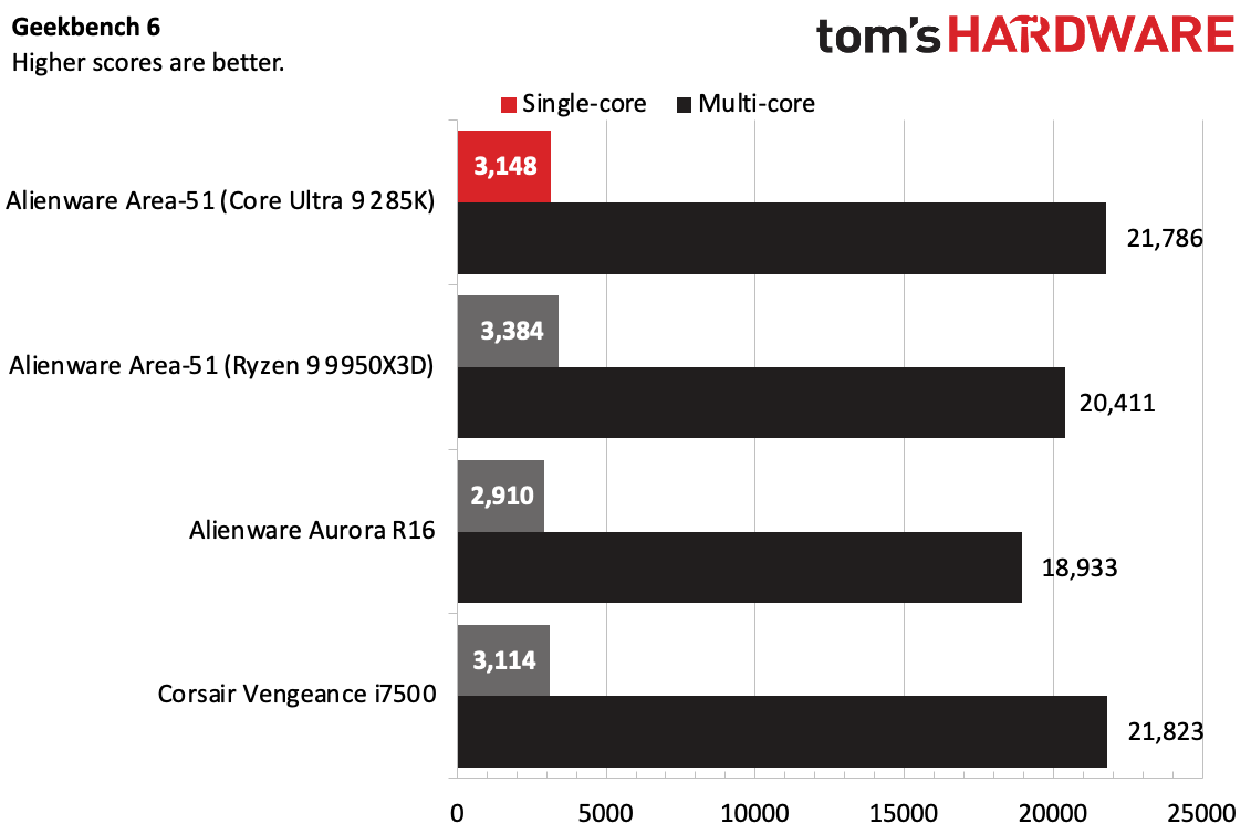 В тесте Geekbench 6 процессор Area-51 на базе Ryzen показал лучший результат в одноядерном режиме — 3384 балла, немного опередив версию с Core Ultra 9 (3148). Система охлаждения в Vengeance i7500 позволила добиться результата в многоядерном режиме, немного превзойдя 21786 баллов у Intel Alienware.