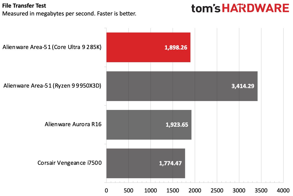Настольный компьютер Alienware с процессором Core 285K передал 25 ГБ файлов со скоростью 1898,26 МБ/с, а система с 9950X3D показала впечатляющие 3414,29 МБ/с, превзойдя Vengeance, но уступив Aurora. Разница между двумя системами на базе Intel, вероятно, заключается в используемых накопителях. Хотя обе системы оснащены SSD-накопителями объемом 2 ТБ, в системе на базе Intel использовался SK hynix PC811, а в системе на базе AMD — Samsung PM9E1 SED SSD.