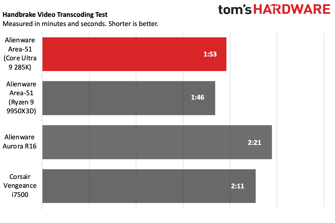 В программе Handbrake Area-51 показала лучшие результаты, преобразовав видео 4K в 1080p за 1 минуту и 46 секунд с процессором Ryzen и за 1 минуту и 53 секунды с процессором Intel.
