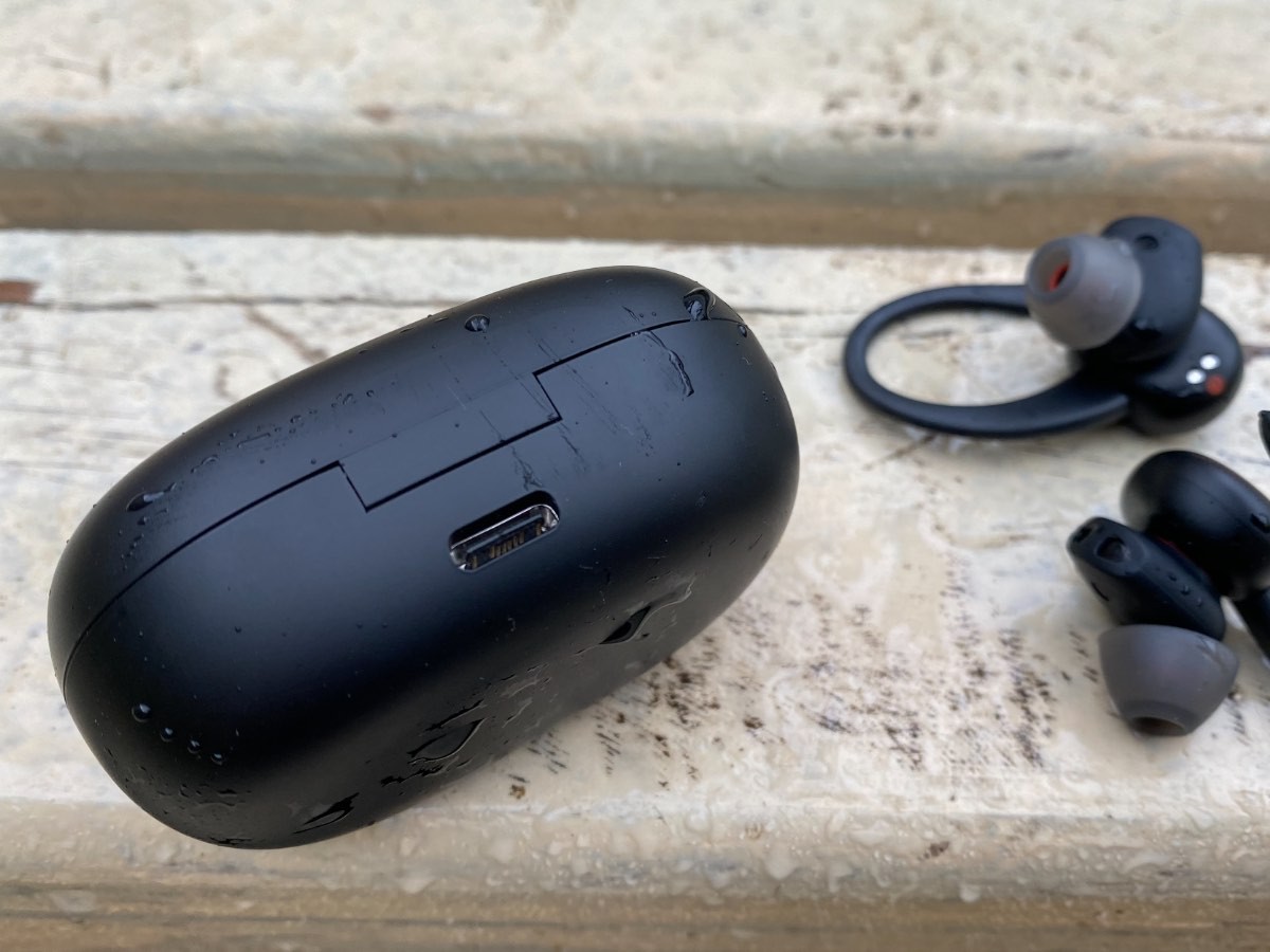 Пара слов про кейс. Он обычный. Толстенький, тяжеленький, округлый. Две свои основные функции — заряжать наушники и подключать их к смартфону — выполняет.
