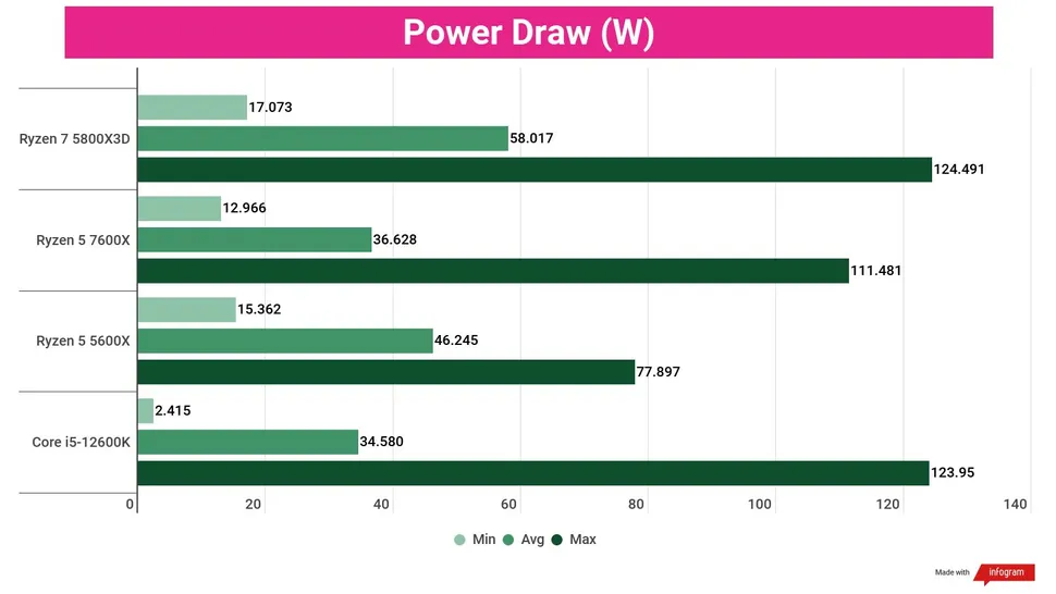 Да, Ryzen 5 7600X потребляет заметно больше энергии по сравнению со своим предшественником, 5600X. Однако следует отметить, что это актуально только при полной загрузке чипа. В ходе нашего тестирования максимальная потребляемая мощность составила 111 Вт по сравнению с 78 Вт у 5600X, но в среднем во всех наших тестах она была на 10 Вт ниже.