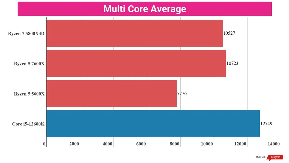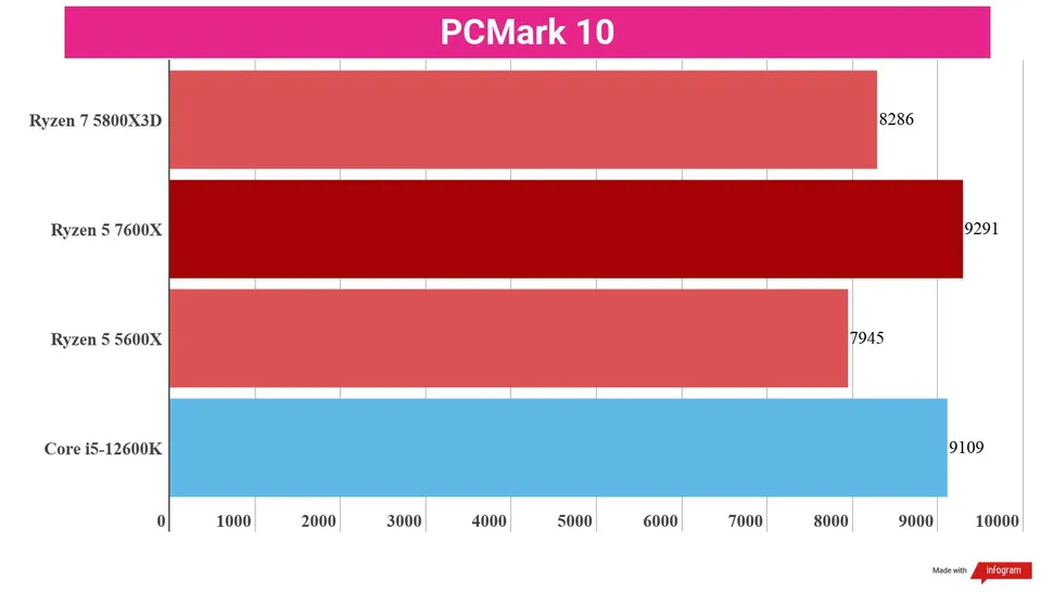 Производительность в многоядерных синтетических тестах также немного уступает конкурирующим чипам Intel, но это неудивительно, учитывая преимущества архитектуры Intel big.LITTLE в многоядерных рабочих нагрузках. Но если честно? Эти недостатки не являются проблемой. AMD позиционирует 7600X как «процессор, созданный для интенсивных игр», и это утверждение полностью соответствует действительности.