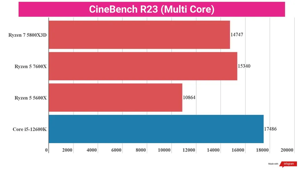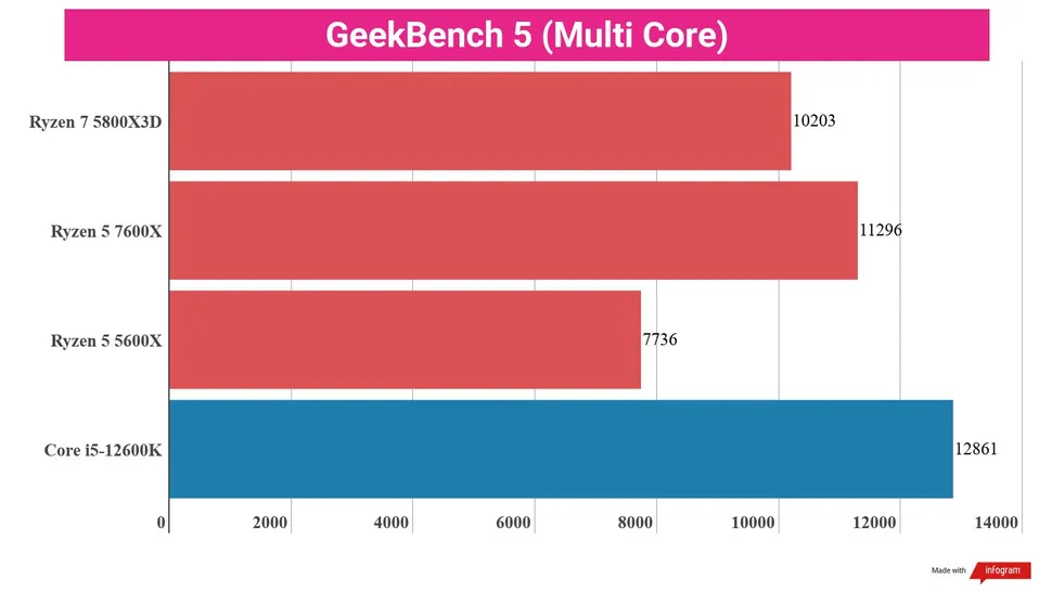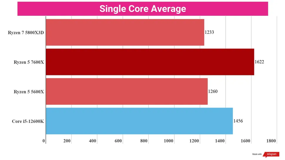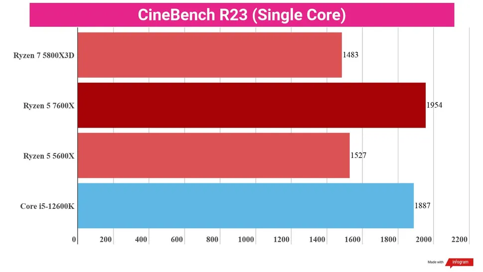 Повышенное энергопотребление и тепловыделение Ryzen 5 7600X неудивительны, если посмотреть на показатели производительности. С одноядерными показателями 1954 и 2141 в Cinebench R23 и Geekbench 5 соответственно процессор Ryzen 5 7600X превосходит аналог Intel 12-го поколения и может даже соперничать с Core i9-12900K — процессором, который стоит почти в два раза дороже.