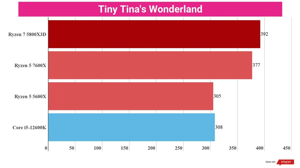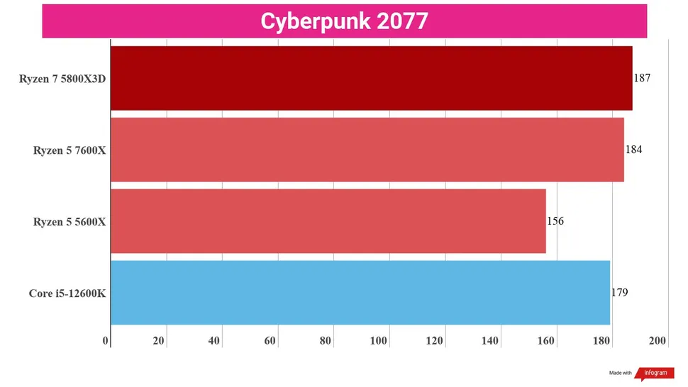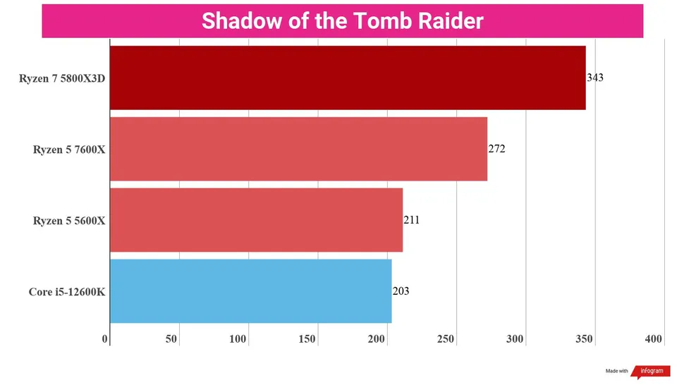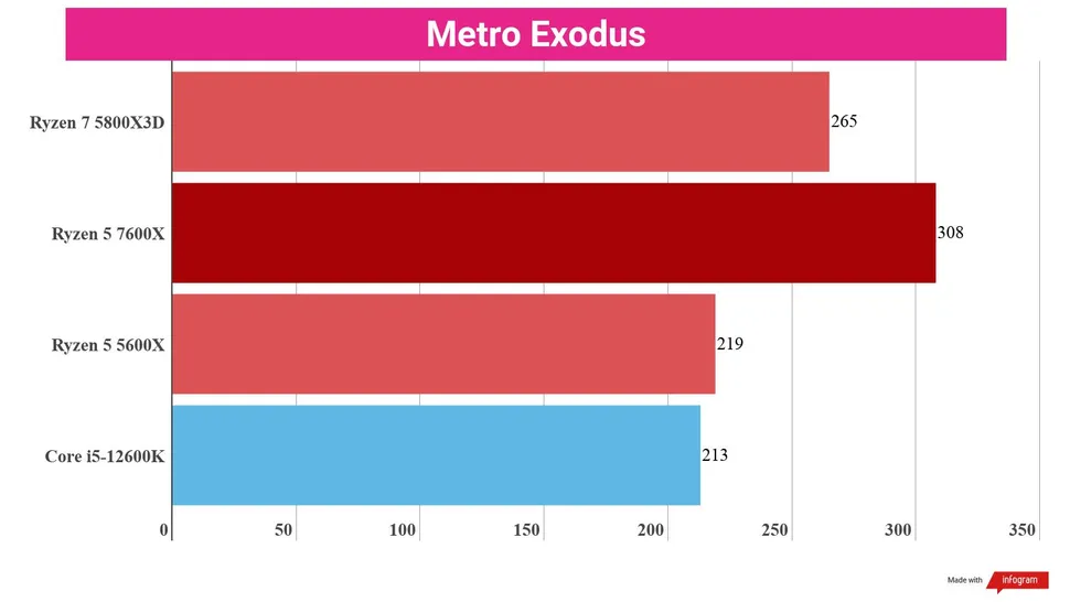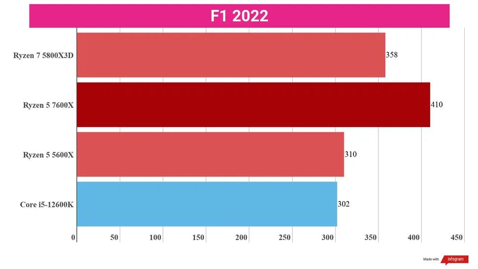 Эти мощные ядра также превосходят 12900K в однопоточной игровой производительности, демонстрируя невероятные результаты в Metro: Exodus, F1 2022 и Shadow of the Tomb Raider. В других играх результаты не такие хорошие, но это всё равно исключительно высокие показатели: средняя игровая производительность выросла более чем на 20 % по сравнению с Ryzen 5600X.
