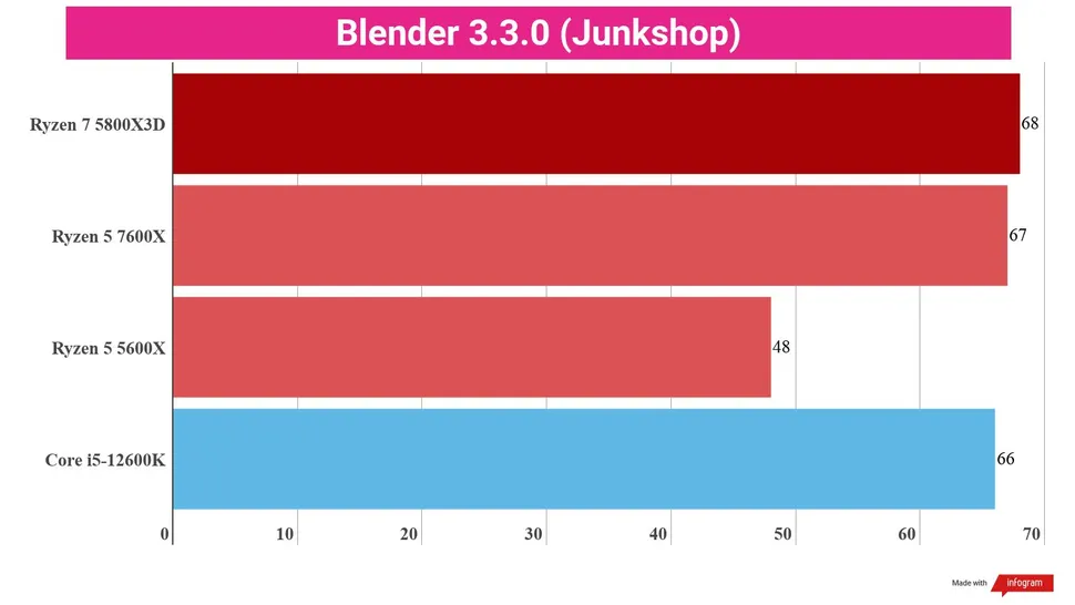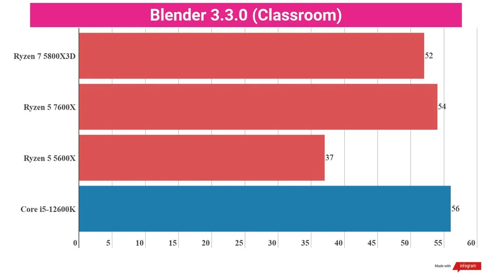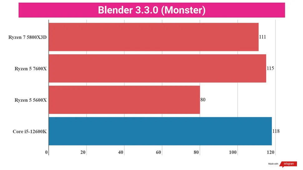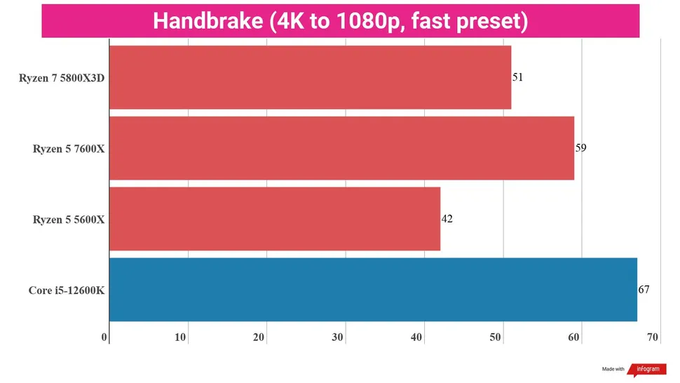 Одна из областей, в которой 7600X немного отстаёт, — это кодирование и рендеринг видео. Наши тесты в Handbrake и Blender показали результаты, аналогичные результатам Core i5-12600K. Конечно, это не катастрофа, но и не очень хорошо, учитывая, что Intel готовит чипы 13-го поколения. Производительность при рендеринге неплохая, но этот процессор не подойдёт для профессиональных творческих людей.